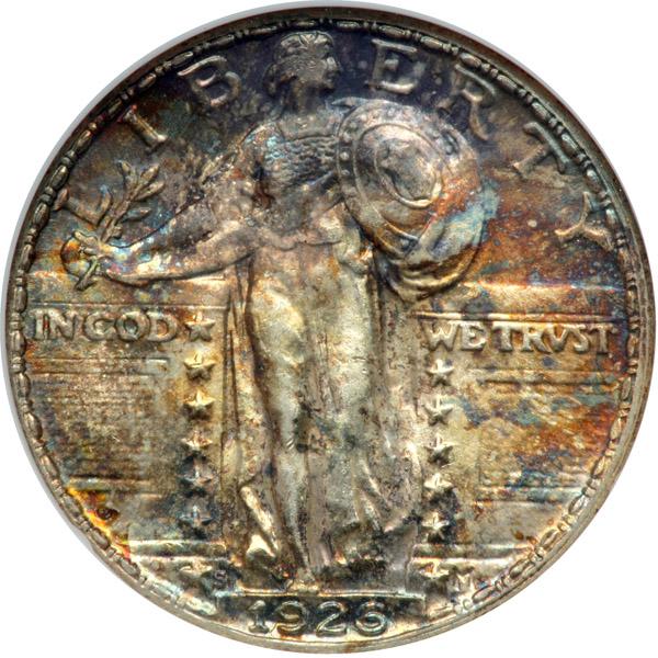 1926-S. NGC graded MS-64. A well struck example with the head nearly full. The obverse exhibits natural mottled blue, violet and russet toning, while the reverse toning is more subdue. Lustrous underneath the color. In an old holder. Pop 84; 42 finer .