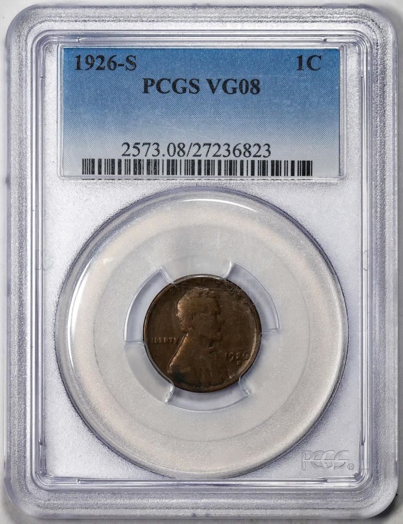 One 1926-S Lincoln Wheat Cent Coin PCGS VG08. PCGS Graded.