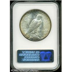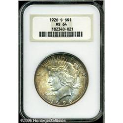 <B>1926-S<img border='0' src='http://www.heritagecoins.com/images/star.gif' width=10 height=10>$1 MS64 NGC.</B></I> Golden-brown, lilac, and cobalt-blue patina covers most of the border areas, especially on the obverse. Well struck on the devices. A couple of light marks are seen on Liberty's cheek and neck. Lot:10715