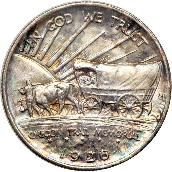 1926-S Oregon Trail Half Dollar. NGC graded MS-66. Lovely reverse toning. A desirable, frosty Gem with no visible imperfections (PCGS # 9341) .