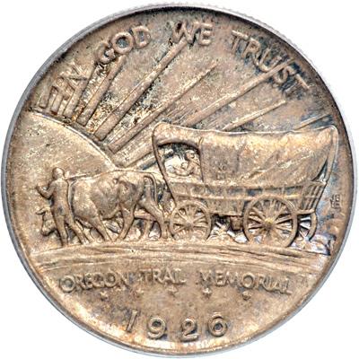 1926-S Oregon Trail Half Dollar. PCGS graded MS-64 PQ. Nice original antique toning. There is nothing more infuriating than a coin with wonderful original color and then a big toning blob or offending mark. This lovely specimen, nearly in the gem class, has neither. It is truly attractive.
