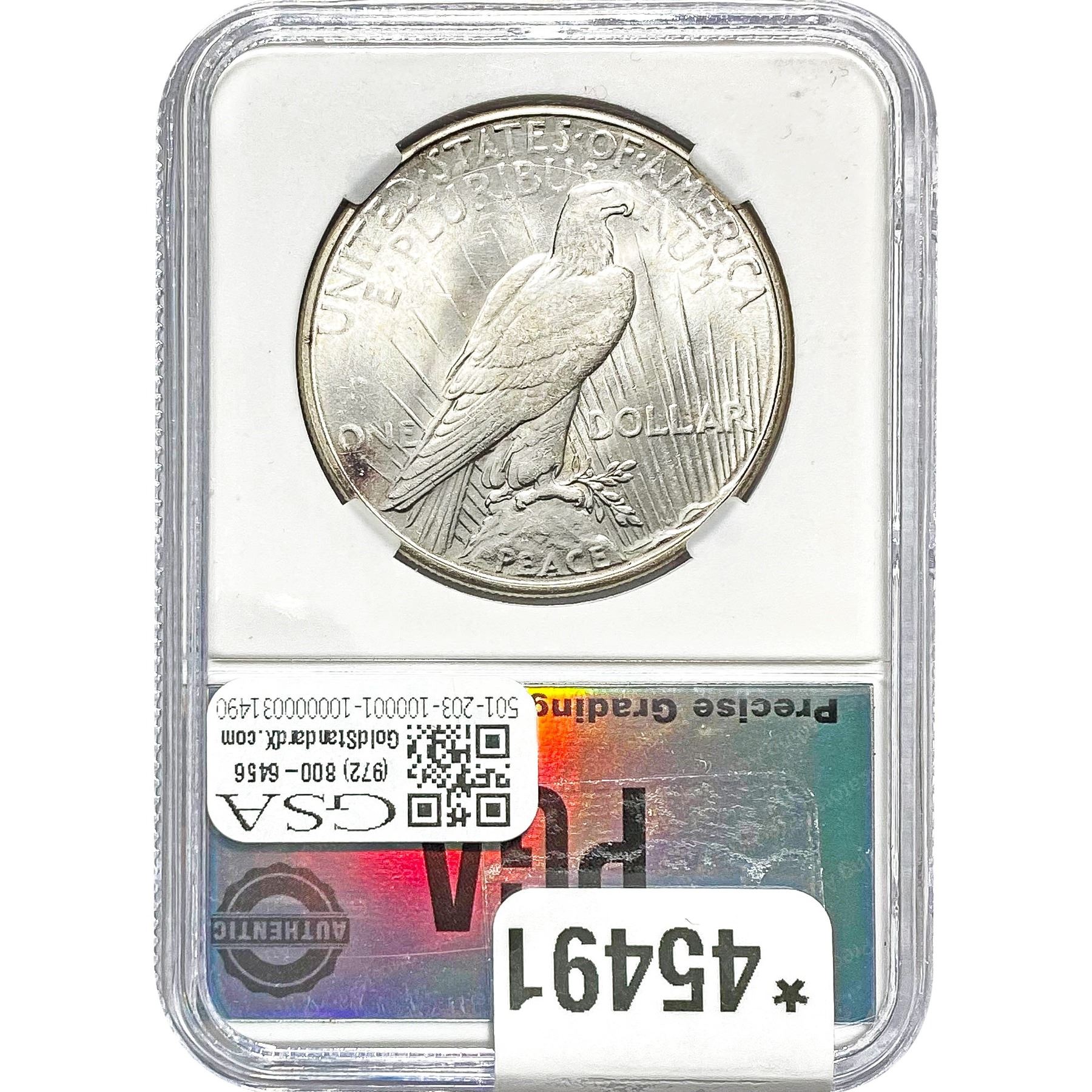 COINS AND CURRENCY LISTED IN GSA’S CATALOG AS GRADED AND ENCAPSULATED BY PCGS, NGC, ANACS, ICG, PCGS CURRENCY, PMG, PCGS BANKNOTE GRADING, CMC OR ANY OTHER THIRD-PARTY GRADING SERVICE ARE LIKEWISE SOLD “AS-IS” EXCEPT AS EXPRESSLY SET FORTH HEREIN. ALL THIRD-PARTY GRADING SERVICE GUARANTEES, INCLUDING AUTHENTICITY, ARE THE SOLE RESPONSIBILITY OF THE THIRD-PARTY GRADING SERVICE AND NOT WARRANTIES OR GUARANTEES OF GSA. BIDDERS SHOULD CONTACT THESE THIRD-PARTY GRADING SERVICES DIRECTLY WITH RESPECT TO ANY CLAIMS OR QUESTIONS THEY MAY HAVE CONCERNING THEIR GUARANTEES AND WARRANTIES. BIDDERS ACKNOWLEDGE AND AGREE THAT AUCTIONEER IS NOT BOUND BY OR LIABLE FOR ANY OPINION OR CERTIFICATION BY ANY THIRD-PARTY GRADING SERVICE. REMOVAL OF A PRODUCT FROM ITS PROTECTIVE CASING OR HOLDER OR ALTERATION OF ANY COIN HOLDER WAIVES ALL RIGHTS CONCERNING THE PRODUCT CONTAINED THEREIN.