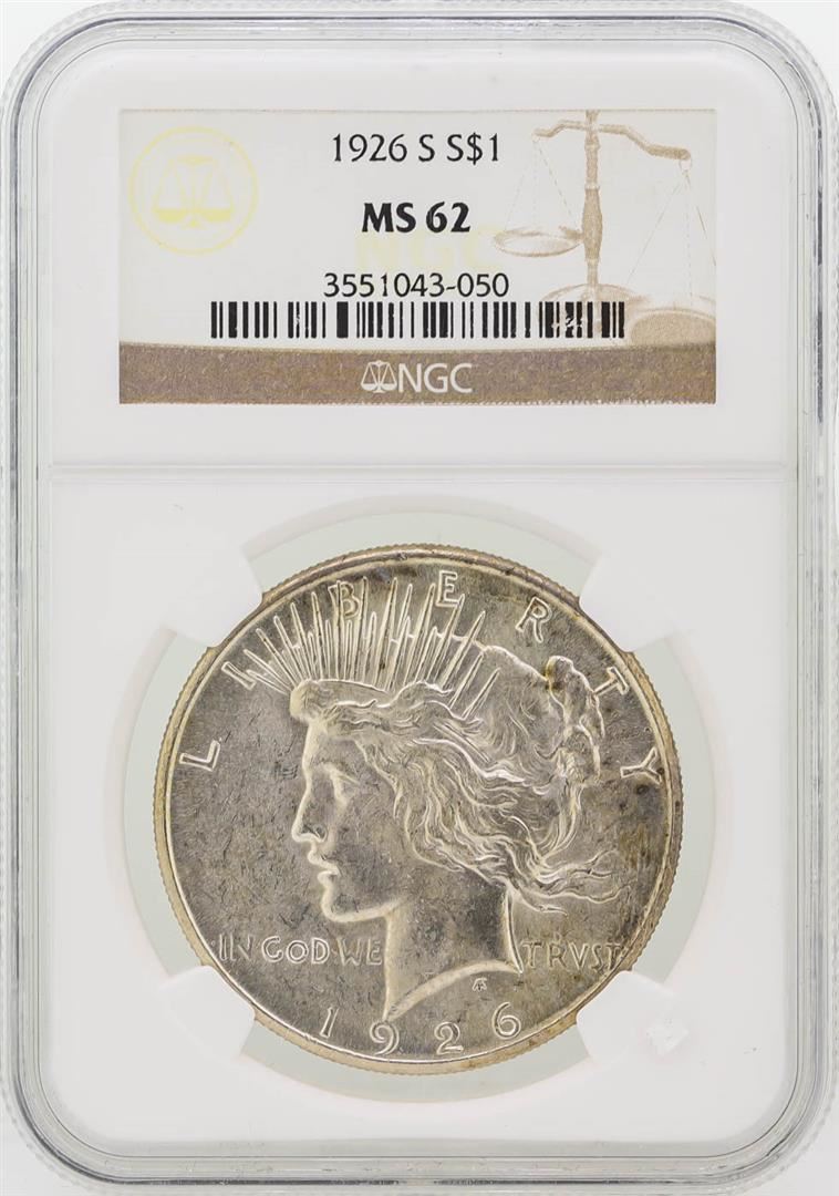 One 1926-S Peace Silver Dollar Coin NGC Graded MS62. NGC Certified.