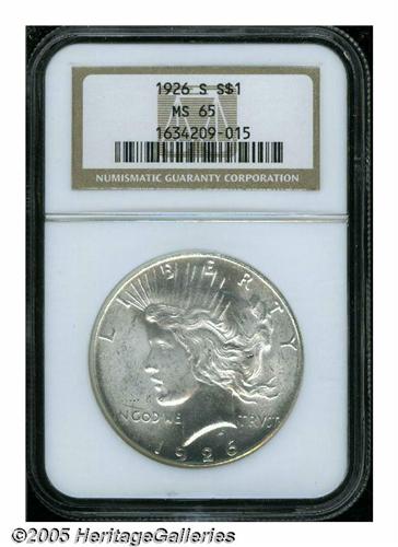 <B>1926-S<S$1> MS65 NGC.</B></I> A brilliant and highly lustrous Gem that has a very good strike and lovely surfaces that exhibit just a few minute marks over each side. Although nearly 7 million pieces were minted, Gems are surprisingly scarce. NGC has certified only 22 pieces finer (5/05).