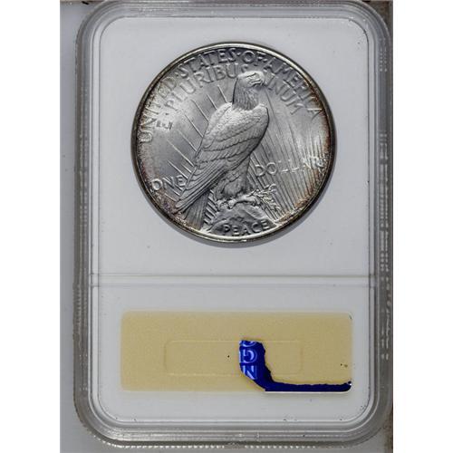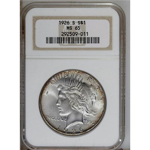 <B>1926-S<img border='0' src='http://www.heritagecoins.com/images/star.gif' width=10 height=10>$1> MS65 NGC.</B></I> Copper-gold and apple-green freckles brighten the borders, while the fields and devices are both lustrous and untoned. An exacting strike and pleasing preservation ensure the quality of this older holder Gem.