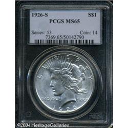 1926-S S$1 MS65 PCGS. A brilliant and meticulously <B>1926-S S$1 MS65 PCGS.</B></I> A brilliant and meticulously struck Gem that possesses potent luster and has exemplary preservation. A lovely better date Peace Dollar fit for a competitive Registry Set. <BR><BR><B>Important notice:</B> Heritage usually auctions material at the rate of 200-250 lots per hour. On some occasions eBay Live bid software or the Internet may not be able to keep up with the pace of the auction. We recommend placing a realistic absentee bid now as insurance to avoid disappointment. Occasionally the auctioneer may eliminate or reject an eBay Live bid, and the auctioneer may also reopen a lot after the close of the eBay live bidding (usually because we missed an audience bid), and may reject your bid even if it shows you as the winning bidder. By bidding via eBay Live, you agree that Heritage may award the lot to another bidder at its sole discretion under the circumstances described above or any other reasonable circumstances. Since eBay bids are not shown to us until we open the lot on the floor, we treat those bids just like floor bids. In most cases the floor responds before the eBay bid is presented to us, due to Internet lag time, so for consistency we have made it a policy that floor bids are always considered first over tie eBay live bids. Also please note that all Heritage lots purchased through eBay Live carry a 20% Buyer's Premium. Please make sure you read the Terms and Conditions before you bid. This lot is being auctioned in conjunction with a live floor auction by Heritage Galleries & Auctioneers. All final auction and invoice information will be supplied by Heritage Galleries & Auctioneers, and all other information should be considered preliminary. Lot:7796