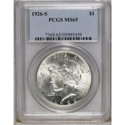 <B>1926-S S$1 MS65 PCGS.</B></I> A nicely struck Gem example that has frosty luster and thin, milky patina over the obverse and reverse fields. A few isolated marks are present on each side.<BR><BR><b>Shipping:</b> Coin/Currency (<a target="_blank" href="http://www.heritageauctions.com/common/shipping.php">view shipping information</a>)