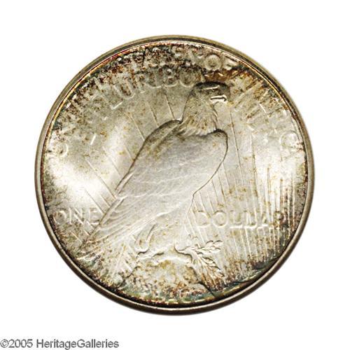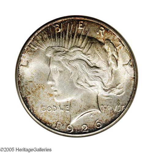 <B>1926-S<S$1> MS66 NGC.</B></I> Rather easily located in lower grades, the '26-S is a significant rarity above the MS65 level. Both sides exhibit unbroken satin luster and a smooth sheen. Attractive reddish-gold toning in varying hues decorates each side. The obverse is quite well defined for the series, but the eagle's portrait is somewhat softly impressed over the highest points. Census: 23 in 66, none are finer (10/05).<BR><I>From The Albert E. Willis Collection.</B></I>