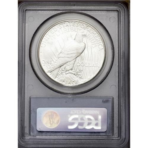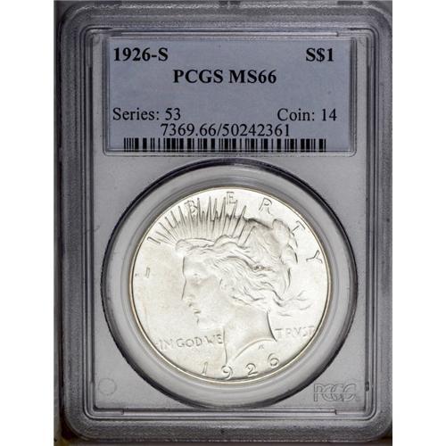 <B>1926-S<img border='0' src='http://www.heritagecoins.com/images/star.gif' width=10 height=10>$1> MS66 PCGS.</B></I> The 1926-S is one of those magical date/mint combinations in numismatics that resonates with collectors, as Mint State specimens in the various denominations are usually elusive, expensive, and often difficult to find in top condition. So it is with this lovely Peace dollar. Although the issue is relatively obtainable in lower grades, the population drops rather precipitously at the Gem level, and is highly elusive any finer. This example offers lovely silver-blue, satiny surfaces with brilliant luster. Except for a couple of tiny luster grazes, a single tick on Liberty's brow, and a bit of surface roughness on the eagle, this phenomenal example might actually attain an even finer grade. Population: 48 in 66, 1 finer (3/06). <BR><BR><B>Important notice:</B> Heritage usually auctions material at the rate of 200-250 lots per hour. On some occasions eBay Live bid software or the Internet may not be able to keep up with the pace of the auction. We recommend placing a realistic absentee bid now as insurance to avoid disappointment. Occasionally the auctioneer may eliminate or reject an eBay Live bid, and the auctioneer may also reopen a lot after the close of the eBay live bidding (usually because we missed an audience bid), and may reject your bid even if it shows you as the winning bidder. By bidding via eBay Live, you agree that Heritage may award the lot to another bidder at its sole discretion under the circumstances described above or any other reasonable circumstances. Since eBay bids are not shown to us until we open the lot on the floor, we treat those bids just like floor bids. In most cases the floor responds before the eBay bid is presented to us, due to Internet lag time, so for consistency we have made it a policy that floor bids are always considered first over tie eBay live bids. Also please note that all Heritage lots purchased through eBay Live carry a 20% Buyer's Premium. Please make sure you read the Terms and Conditions before you bid. This lot is being auctioned in conjunction with a live floor auction by Heritage Galleries & Auctioneers. All final auction and invoice information will be supplied by Heritage Galleries & Auctioneers, and all other information should be considered preliminary. Lot:3853 <BR><BR><B>Winning Notification and Billing:</B> After the FINAL session in this auction is complete, Heritage will send e-mail and snail mail invoices. This process normally takes several days. All final auction and invoice information will be supplied by Heritage Galleries & Auctioneers, and all other information should be considered preliminary. <BR><BR>This auction will be conducted on a live auction floor and over the Internet through eBay Live. If you choose to place an absentee bid, please take a moment to <font color='#0000ff'><u><a href='http://pages.ebay.com/liveauctions/help/before/laabsentee.html'>learn how eBay Live absentee bidding works</a></u></font><font color='#000000'>