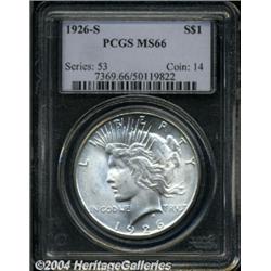 <B>1926-S<S$1> MS66 PCGS.</B></I> This is a lovely snow-white Gem with exquisite eye appeal. The strike is sharp and the surfaces are frosty. This example is among the finest certified for the date and is sure to please the new owner. Population: 30 in 66, 1 finer (3/04). <BR><BR><B>Important notice:</B> Heritage usually auctions material at the rate of 200-250 lots per hour. On some occasions eBay Live bid software or the Internet may not be able to keep up with the pace of the auction. We recommend placing a realistic absentee bid now as insurance to avoid disappointment. Occasionally the auctioneer may eliminate or reject an eBay Live bid, and the auctioneer may also reopen a lot after the close of the eBay live bidding (usually because we missed an audience bid), and may reject your bid even if it shows you as the winning bidder. By bidding via eBay Live, you agree that Heritage may award the lot to another bidder at its sole discretion under the circumstances described above or any other reasonable circumstances. Since eBay bids are not shown to us until we open the lot on the floor, we treat those bids just like floor bids. In most cases the floor responds before the eBay bid is presented to us, due to Internet lag time, so for consistency we have made it a policy that floor bids are always considered first over tie eBay live bids. Also please note that all Heritage lots purchased through eBay Live carry a 20% Buyer's Premium. Please make sure you read the Terms and Conditions before you bid. </span></font></tr></table></td></tr></table>