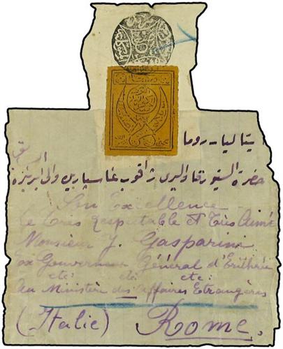 1926 SANA´A a ROMA (Italia). 2 1/2 bogaches. Frente de carta dirigido al Gobernador General de Eritrea. MUY RARA. Cert. B.P.A.