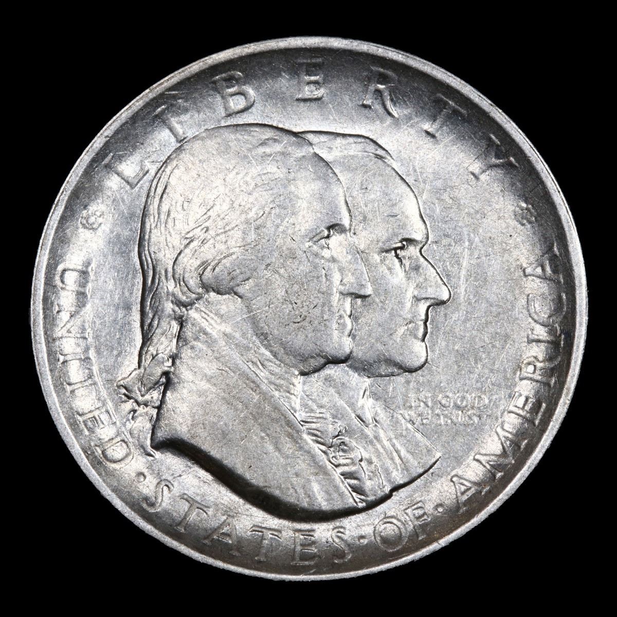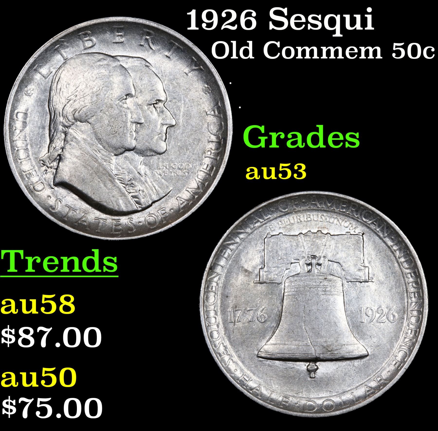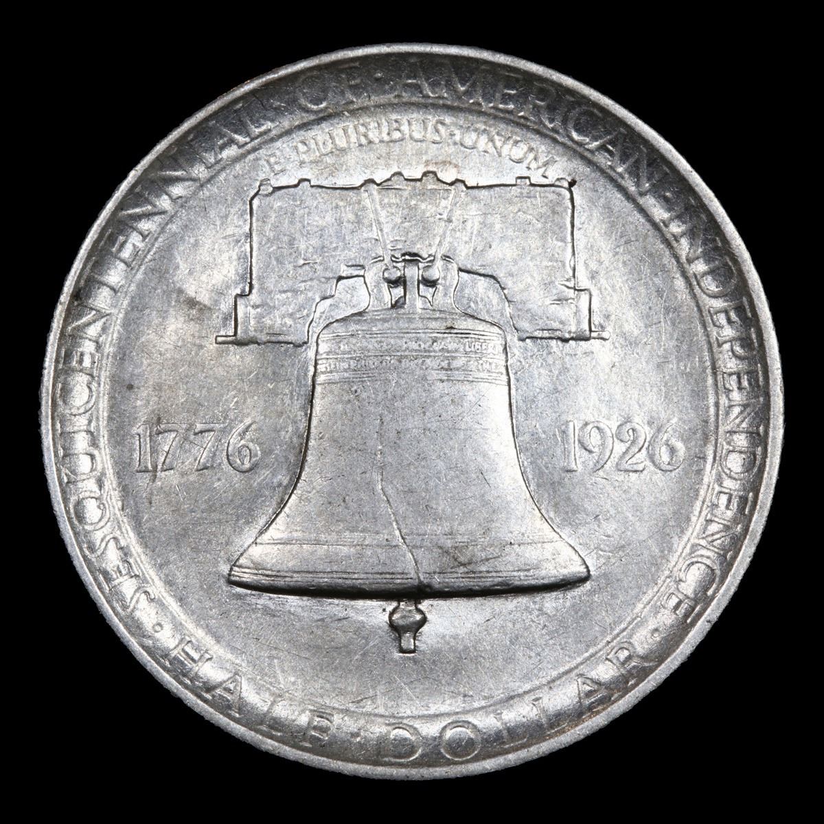 1926 Sesqui . . Old Commem Half Dollar 50c Grades Select AU. This Coin is Very Reminiscent of The Reverse of the Franklin Half which would be Used 22 Years After this Coin was Struck. When Examining a Sesquicentennial Commemorative The first places to show wear on the coins are Washington's cheekbone and the lower part of the bell.