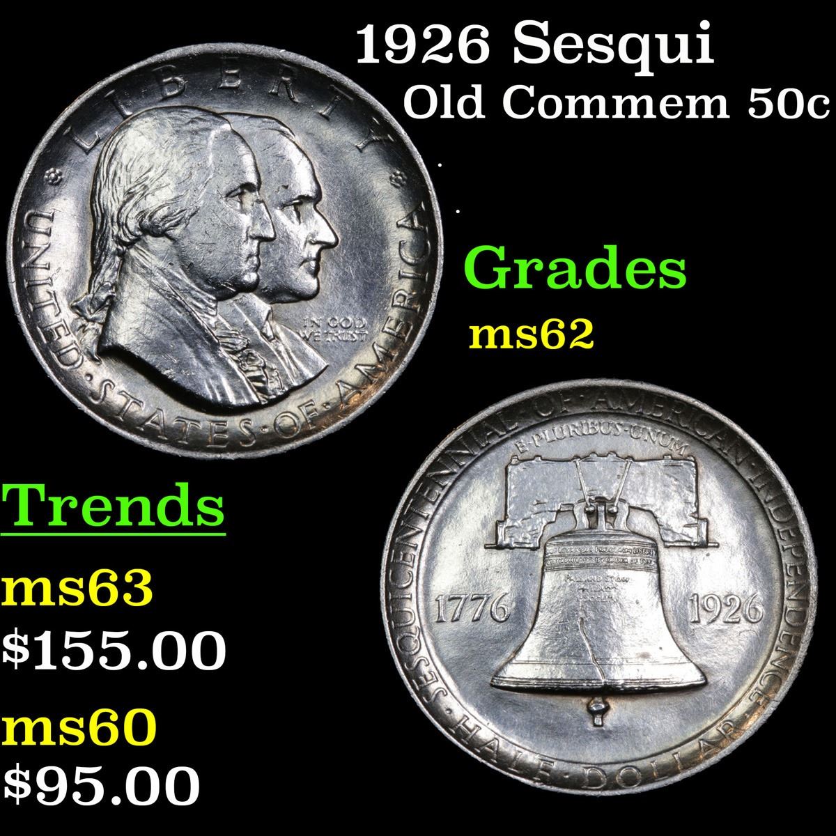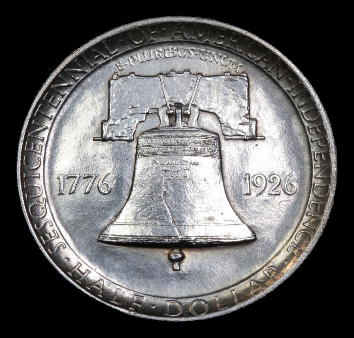 1926 Sesqui . . Old Commem Half Dollar 50c Grades Select Unc. This Coin is Very Reminiscent of The Reverse of the Franklin Half which would be Used 22 Years After this Coin was Struck. When Examining a Sesquicentennial Commemorative The first places to show wear on the coins are Washington's cheekbone and the lower part of the bell.
