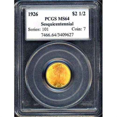 <b>1926 Sesquicentennial Gold $2.50. PCGS graded MS64.</b> With flattering bright mint luster and a minimum number of wispy abrasions, this peach-gold coin is every bit the MS64 it is represented to be <b>(PCGS # 7466)</b>