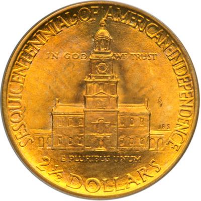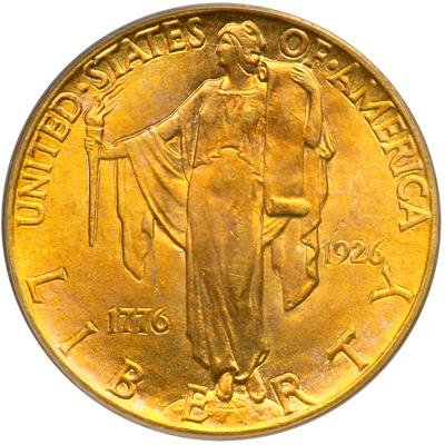 1926 Sesquicentennial Gold $2.50. PCGS graded MS-65 PQ. Rich golden frost on both sides. Luxuriant orange-gold color is seen over each side with light accents of yellow-gold shining through. Only the second gold commemorative using this denomination, the obverse has a standing female figure symbolic of Liberty, holding in one hand a scroll representing the Declaration of Independence and in the other the Torch of Freedom. The reverse bears a representation of Independence Hall in Philadelphia. The coin was designed by John R. Sinnock.Pop 1665; 115 in MS66. (PCGS # 7466).