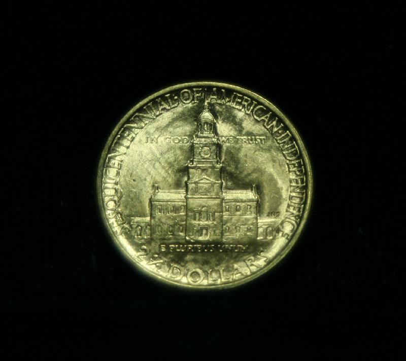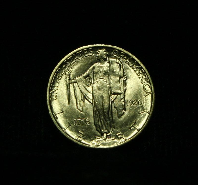 Beautiful well struck example that shows the usually missing rays of the sun behind Independence Hall. Very nice lustrous example of this rare Gold Commemorative. Issued in 1926 along with the Silver 50c piece to celebrate the 150th anniversary of the signing of the Declaration of Independence. When Examining a Gold Sesquicentennial wear first appears on the obverse at the bottom of the scroll; on the reverse, check the clock tower just above the roof line. Coin World's Coin Values lists ms65 at $3000 and The Wholesale Greysheet lists ms65 at $2750. Estimated Value $2800