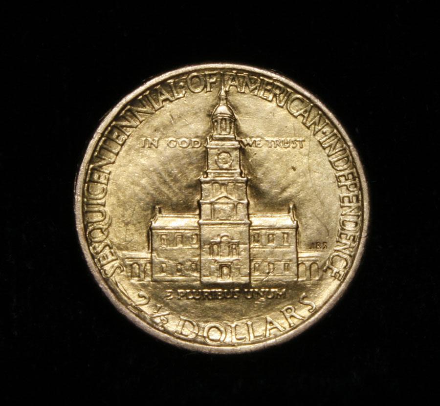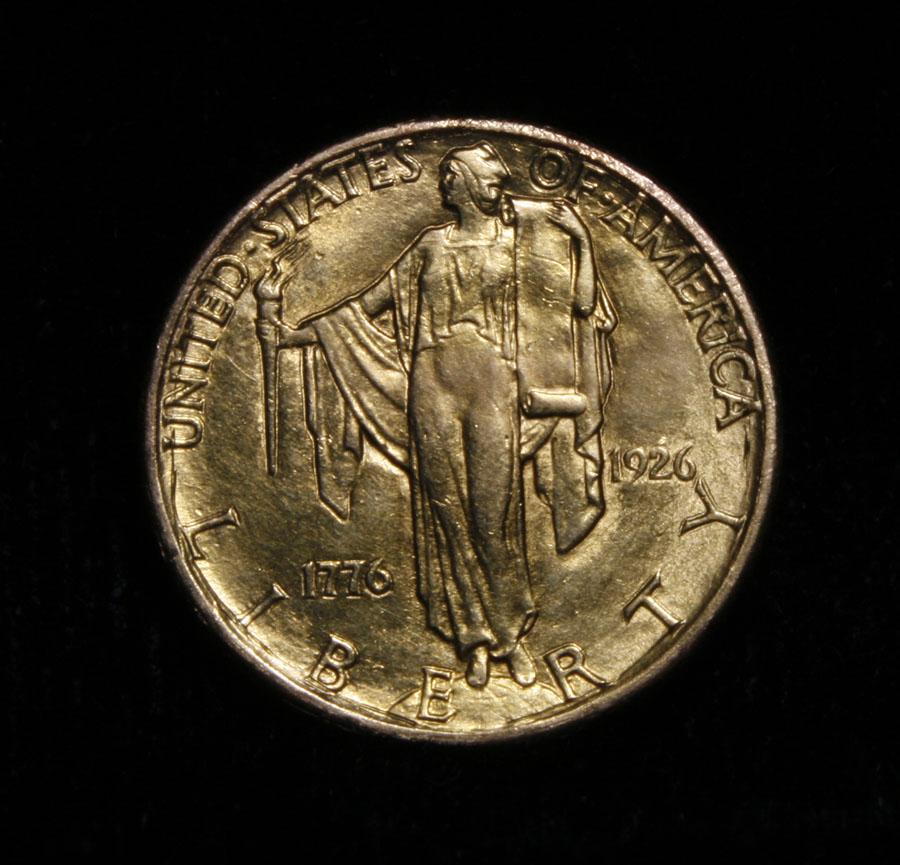 Very nice lustrous example of this rare Gold Commemorative. Issued in 1926 along with the Silver 50c piece to celebrate the 150th anniversary of the signing of the Declaration of Independence. When Examining a Gold Sesquicentennial wear first appears on the obverse at the bottom of the scroll; on the reverse, check the clock tower just above the roof line. Coin World's Coin Values lists ms63 at $800 and The Wholesale Greysheet lists ms63 at $650. Estimated Value $750