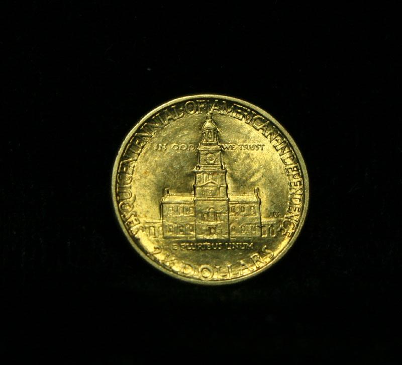Very nice lustrous example of this rare Gold Commemorative. I will offer my personal buy back guarantee, that this coin is all original and will not come back Ungradeable by any major grading service. Issued in 1926 along with the Silver 50c piece to celebrate the 150th anniversary of the signing of the Declaration of Independence. When Examining a Gold Sesquicentennial wear first appears on the obverse at the bottom of the scroll; on the reverse, check the clock tower just above the roof line. Coin World's Coin Values lists ms63 at $800 and The Wholesale Greysheet lists ms63 at $650. Estimated Value $750