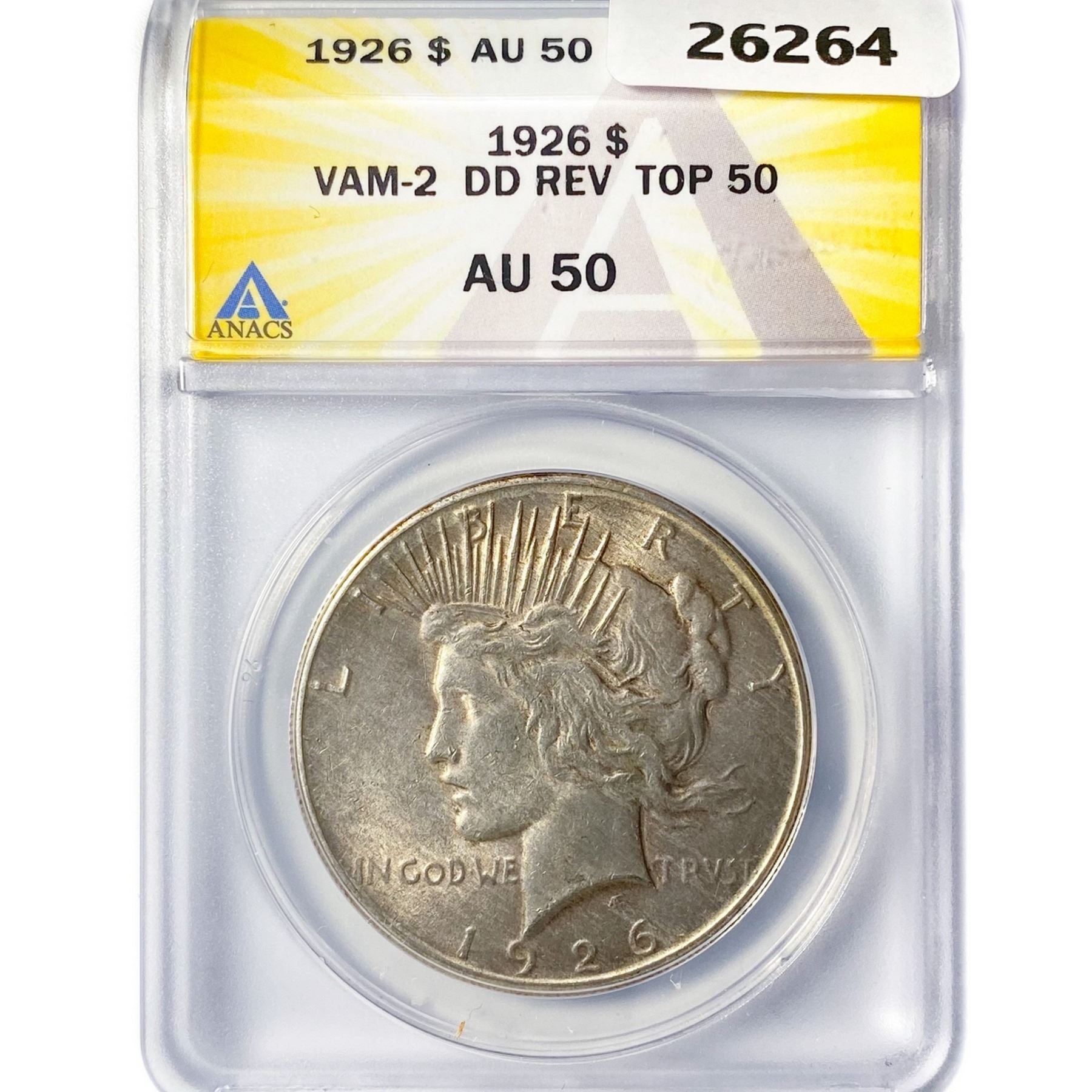 1926 Silver Peace Dollar ANACS AU50 VAM-2 DD REV