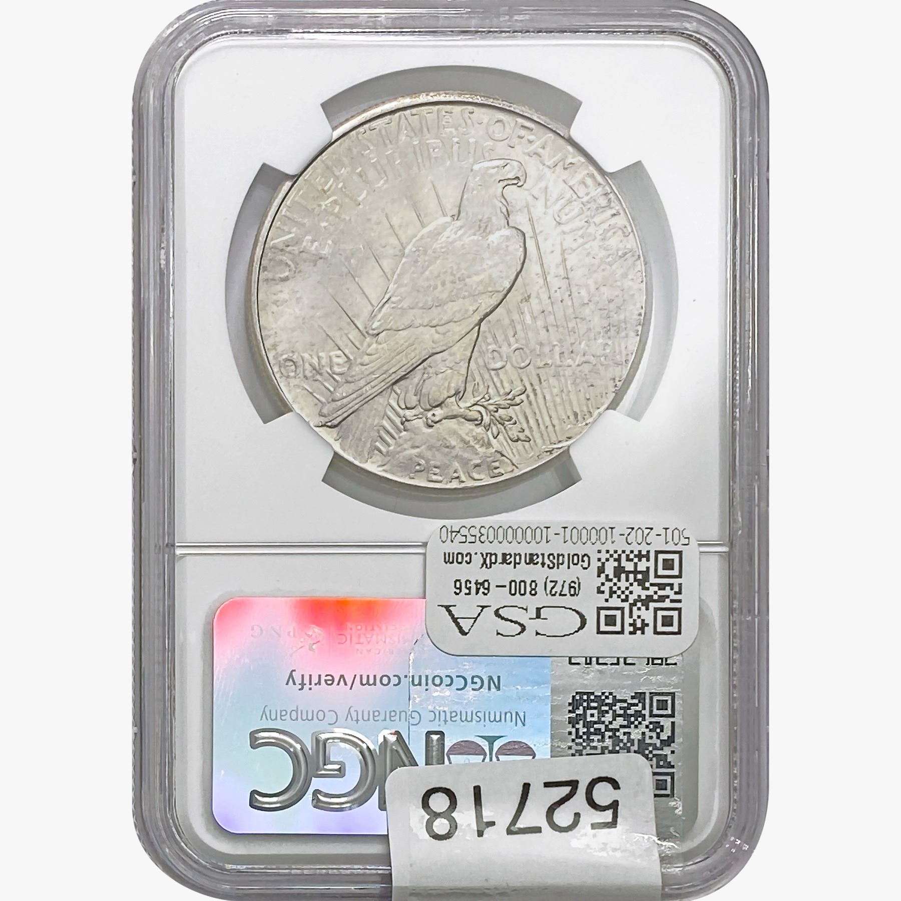 e. Coins sold referencing a third-party grading service are sold “AS IS” without any express or implied warranty, except for a guarantee by GSA that they are genuine. Removal or alteration of the holder, voids all of Bidder’s claims concerning that Product. Certain warranties may be available from the grading services and Bidders are referred to them for further details: Numismatic Guaranty Corporation (NGC), PO Box 4776, Sarasota, FL 34230, www.ngccoin.com/services/writtenguarantee.asp; Professional Coin Grading Services (PCGS), PO Box 9458, Newport Beach, CA 92658, www.pcgs.com/guarantee.html; ANACS, 6555 S. Kenton St., Ste. 303, Englewood, CO 80111; and Independent Coin Grading Co. (ICG), 7901 East Bellview, Ave., Suite 50, Englewood, CO 80111.