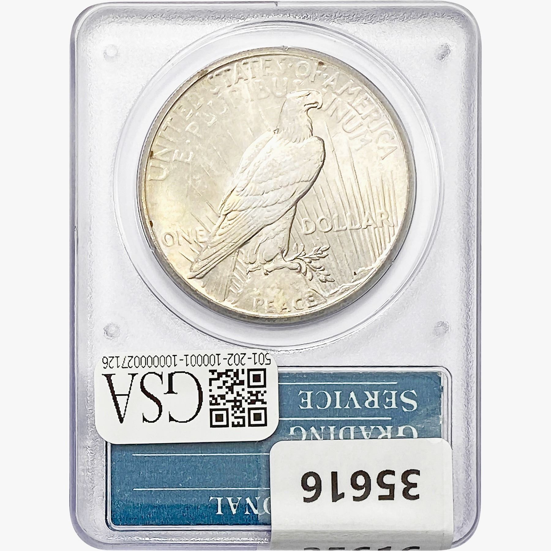 COINS AND CURRENCY LISTED IN GSA’S CATALOG AS GRADED AND ENCAPSULATED BY PCGS, NGC, ANACS, ICG, PCGS CURRENCY, PMG, PCGS BANKNOTE GRADING, CMC OR ANY OTHER THIRD-PARTY GRADING SERVICE ARE LIKEWISE SOLD “AS-IS” EXCEPT AS EXPRESSLY SET FORTH HEREIN. ALL THIRD-PARTY GRADING SERVICE GUARANTEES, INCLUDING AUTHENTICITY, ARE THE SOLE RESPONSIBILITY OF THE THIRD-PARTY GRADING SERVICE AND NOT WARRANTIES OR GUARANTEES OF GSA. BIDDERS SHOULD CONTACT THESE THIRD-PARTY GRADING SERVICES DIRECTLY WITH RESPECT TO ANY CLAIMS OR QUESTIONS THEY MAY HAVE CONCERNING THEIR GUARANTEES AND WARRANTIES. BIDDERS ACKNOWLEDGE AND AGREE THAT AUCTIONEER IS NOT BOUND BY OR LIABLE FOR ANY OPINION OR CERTIFICATION BY ANY THIRD-PARTY GRADING SERVICE. REMOVAL OF A PRODUCT FROM ITS PROTECTIVE CASING OR HOLDER OR ALTERATION OF ANY COIN HOLDER WAIVES ALL RIGHTS CONCERNING THE PRODUCT CONTAINED THEREIN.