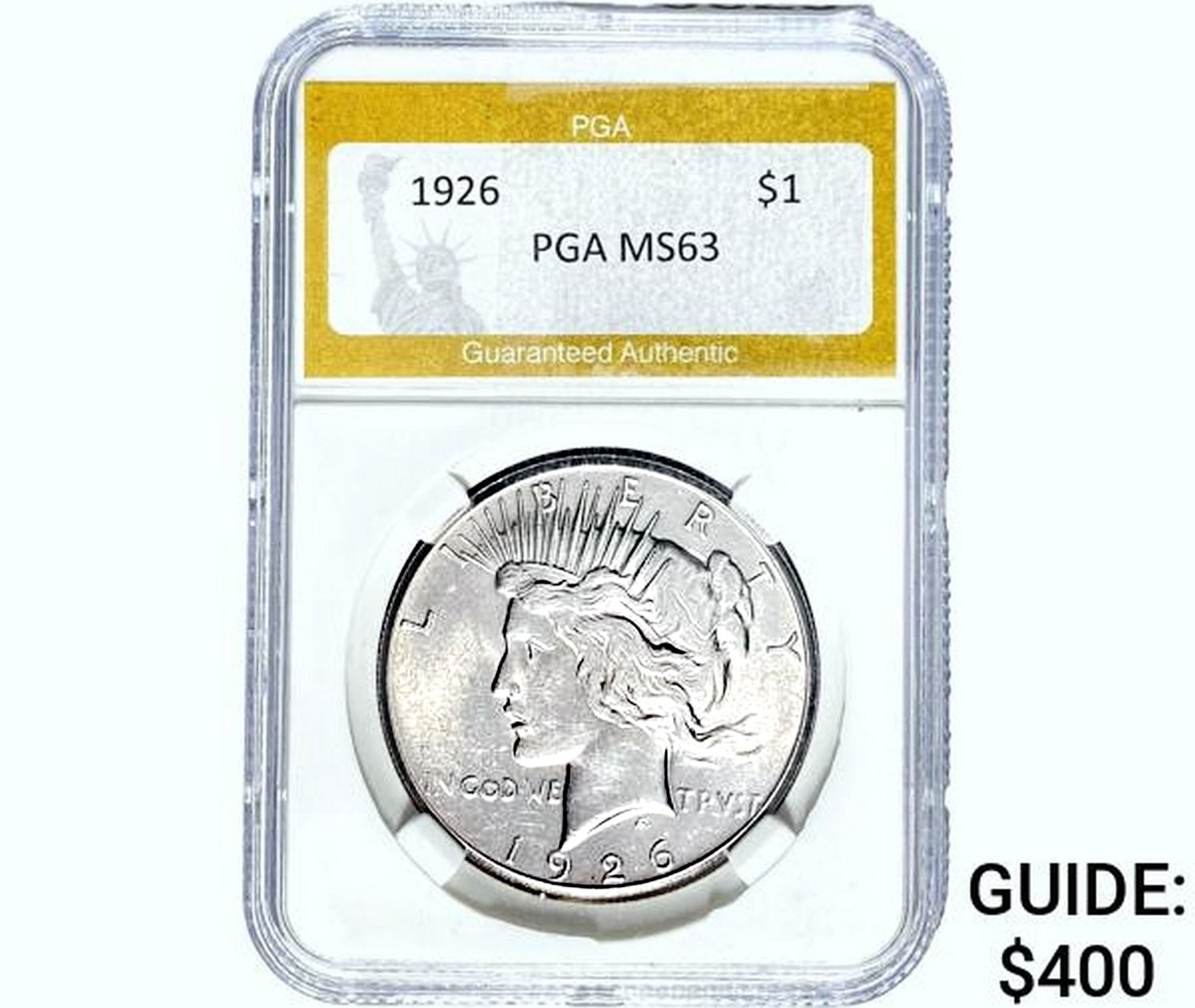 COINS AND CURRENCY LISTED IN GSA’S CATALOG AS GRADED AND ENCAPSULATED BY PCGS, NGC, ANACS, ICG, PCGS CURRENCY, PMG, PCGS BANKNOTE GRADING, CMC OR ANY OTHER THIRD-PARTY GRADING SERVICE ARE LIKEWISE SOLD “AS-IS” EXCEPT AS EXPRESSLY SET FORTH HEREIN. ALL THIRD-PARTY GRADING SERVICE GUARANTEES, INCLUDING AUTHENTICITY, ARE THE SOLE RESPONSIBILITY OF THE THIRD-PARTY GRADING SERVICE AND NOT WARRANTIES OR GUARANTEES OF GSA. BIDDERS SHOULD CONTACT THESE THIRD-PARTY GRADING SERVICES DIRECTLY WITH RESPECT TO ANY CLAIMS OR QUESTIONS THEY MAY HAVE CONCERNING THEIR GUARANTEES AND WARRANTIES. BIDDERS ACKNOWLEDGE AND AGREE THAT AUCTIONEER IS NOT BOUND BY OR LIABLE FOR ANY OPINION OR CERTIFICATION BY ANY THIRD-PARTY GRADING SERVICE. REMOVAL OF A PRODUCT FROM ITS PROTECTIVE CASING OR HOLDER OR ALTERATION OF ANY COIN HOLDER WAIVES ALL RIGHTS CONCERNING THE PRODUCT CONTAINED THEREIN.