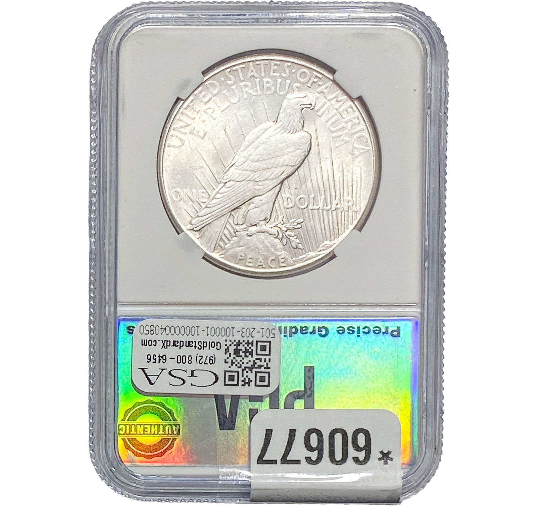 l. All non-certified coins and currency are guaranteed genuine, but are not guaranteed as to grade, since grading is a matter of opinion, an art and not a science, and therefore the description rendered by GSA or any third-party grading service may not agree with the opinion of others (including trained experts), and the same expert may not grade the same item with the same grade at two different times. GSA may, but is not obligated to, express an opinion as to non-certified numismatic items, in GSA’s opinion, or by its employees’ experience and the current interpretation of the American Numismatic Association’s standards as of the date the catalog was prepared. There is no guarantee or warranty expressed or implied that the grading opinions utilized by GSA, if any, will meet the standards of any grading service at any time in the future.