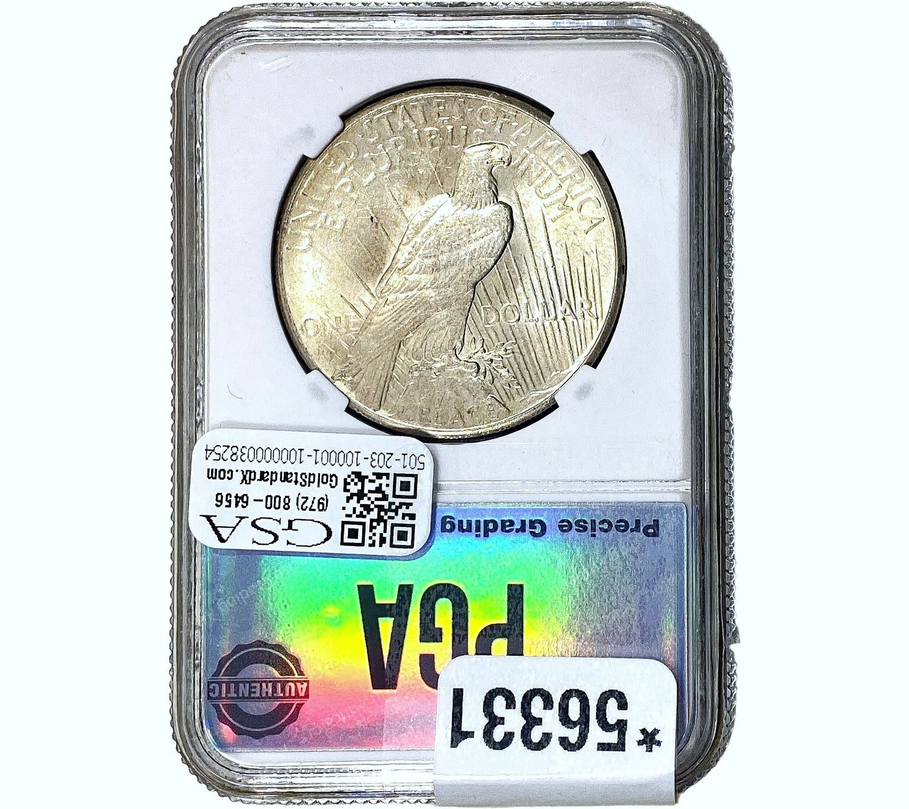 COINS AND CURRENCY LISTED IN GSA’S CATALOG AS GRADED AND ENCAPSULATED BY PCGS, NGC, ANACS, ICG, PCGS CURRENCY, PMG, PCGS BANKNOTE GRADING, CMC OR ANY OTHER THIRD-PARTY GRADING SERVICE ARE LIKEWISE SOLD “AS-IS” EXCEPT AS EXPRESSLY SET FORTH HEREIN. ALL THIRD-PARTY GRADING SERVICE GUARANTEES, INCLUDING AUTHENTICITY, ARE THE SOLE RESPONSIBILITY OF THE THIRD-PARTY GRADING SERVICE AND NOT WARRANTIES OR GUARANTEES OF GSA. BIDDERS SHOULD CONTACT THESE THIRD-PARTY GRADING SERVICES DIRECTLY WITH RESPECT TO ANY CLAIMS OR QUESTIONS THEY MAY HAVE CONCERNING THEIR GUARANTEES AND WARRANTIES. BIDDERS ACKNOWLEDGE AND AGREE THAT AUCTIONEER IS NOT BOUND BY OR LIABLE FOR ANY OPINION OR CERTIFICATION BY ANY THIRD-PARTY GRADING SERVICE. REMOVAL OF A PRODUCT FROM ITS PROTECTIVE CASING OR HOLDER OR ALTERATION OF ANY COIN HOLDER WAIVES ALL RIGHTS CONCERNING THE PRODUCT CONTAINED THEREIN.