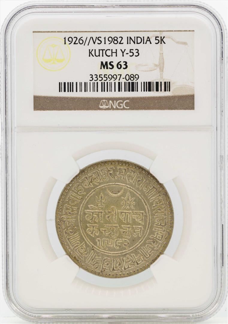 One 1926 VS1982 India 5K Kutch Y-53 Coin NGC MS63. NGC Certified.