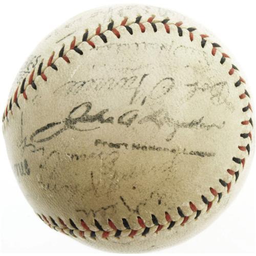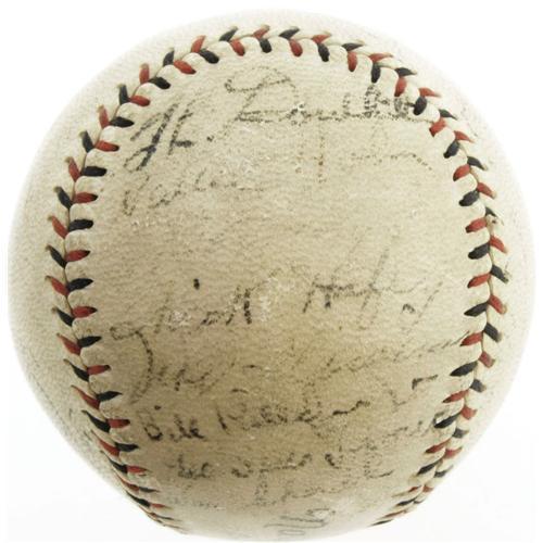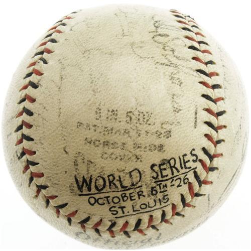 <B>1926 World Series Game Four Used Baseball Signed by Babe Ruth & More.</B></I> We've all heard the story before, and while there are many who argue that it's purely apocryphal, we count ourselves among the true believers. A young boy named Johnny Sylvester, eleven years of age, is lying in a hospital bed, dying of a terrible disease. The Babe, famously generous and indulgent of children, makes a bold promise to lift the boy's spirits. "I'm going to hit a home run for you in Wednesday's game, Johnny," Ruth tells him. "Make sure you're listening on the radio." And sure enough, the Babe is true to his word, clubbing not one, but three long balls in a ten to five victory over the St. Louis Cardinals in Game Four of the '26 Series. The third blast is the longest ever seen in St. Louis, escaping the confines of Sportsman's Park and crashing through the plate glass window of an auto dealership across the street. And young Johnny, feeling he is the beneficiary of a great and magical gift, is miraculously healed. In the film "The Pride of the Yankees," the adult Johnny returns decades later to thank Ruth for saving his life, and John Goodman's "The Babe" also makes use of this heartwarming tale.<BR><BR> Presented here is an Official National League (Heydler) baseball that saw action that fabled day, signed by an assortment of the hometown Cardinals and on the sweet spot by the great Ruth himself. While many of the autographs have faded considerably over the passing years, the Ruth remains among the strongest, an entirely legible 5/10. Others that we can identify include Chick Hafey, Taylor Douthit, Bob O'Farrell, Al Sothoron, Bill Hallahan, Flint Rhem and Ernie Vick. The vintage fan's notation however, penned in dark black vintage ink, has weathered the decades flawlessly. It reads, "World Series, October 6th-'26, St. Louis." The ball exhibits definite game use but still displays exceedingly well, having mellowed with age to an even, attractive tone.<BR><BR> Second only perhaps to Ruth's "Called Shot" in 1932, the tale of the Babe's home runs for the sick boy in the hospital is a critical milestone in the lore of the Bambino. This special ball, used during the watershed event and signed by the Babe on the day of one of his greatest performances, offers the serious collector a chance to bring an element of true enchantment into his trophy room. <I>LOA from PSA/DNA. LOA from James Spence Authentication.</B></I><BR><BR><b>Shipping:</b> Balls, Pucks, etc., Small (<a target="_blank" href="http://www.heritageauctions.com/common/shipping.php">view shipping information</a>)