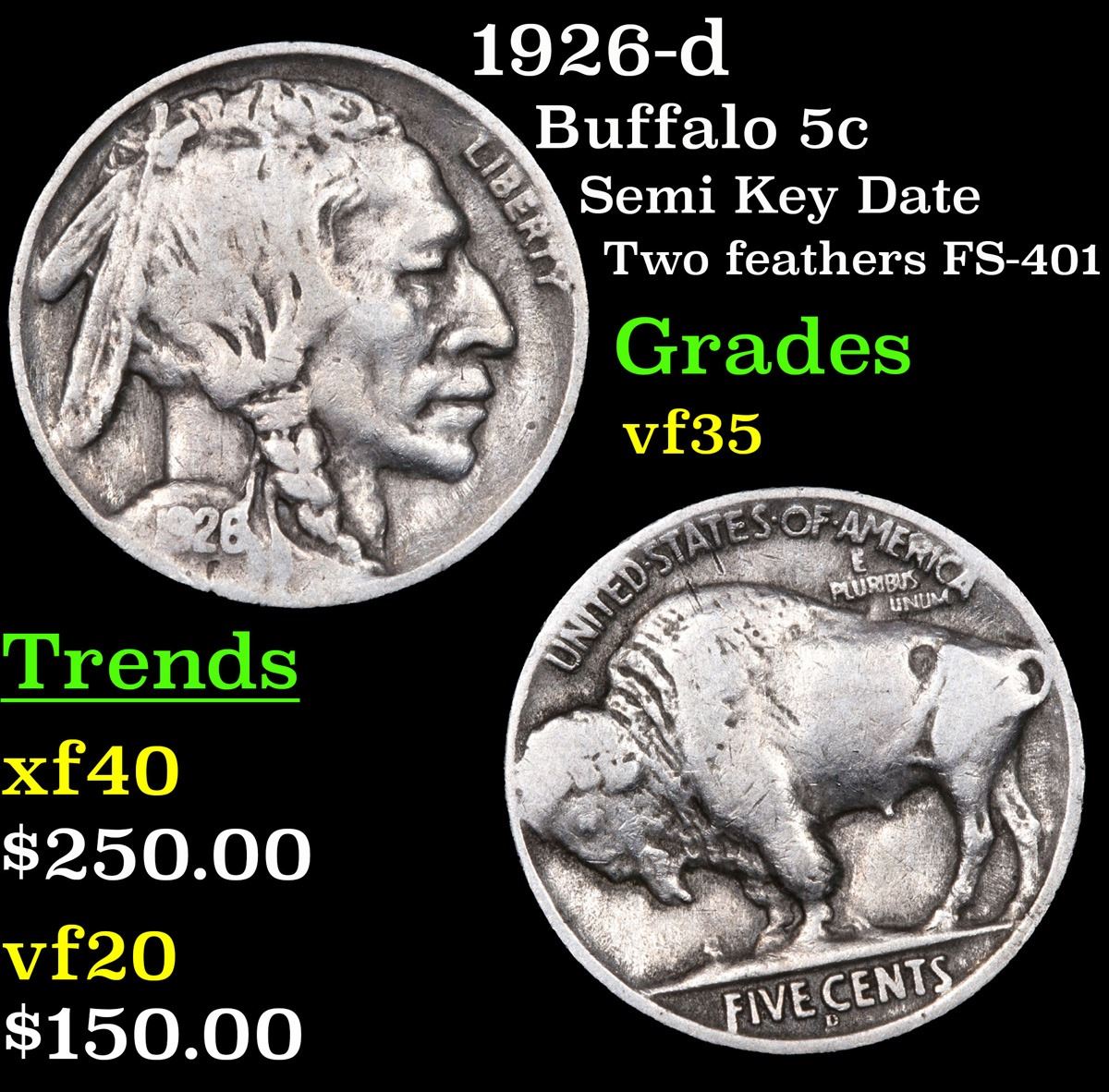 1926-d Semi Key Date Two feathers FS-401 Buffalo Nickel 5c Grades vf++.