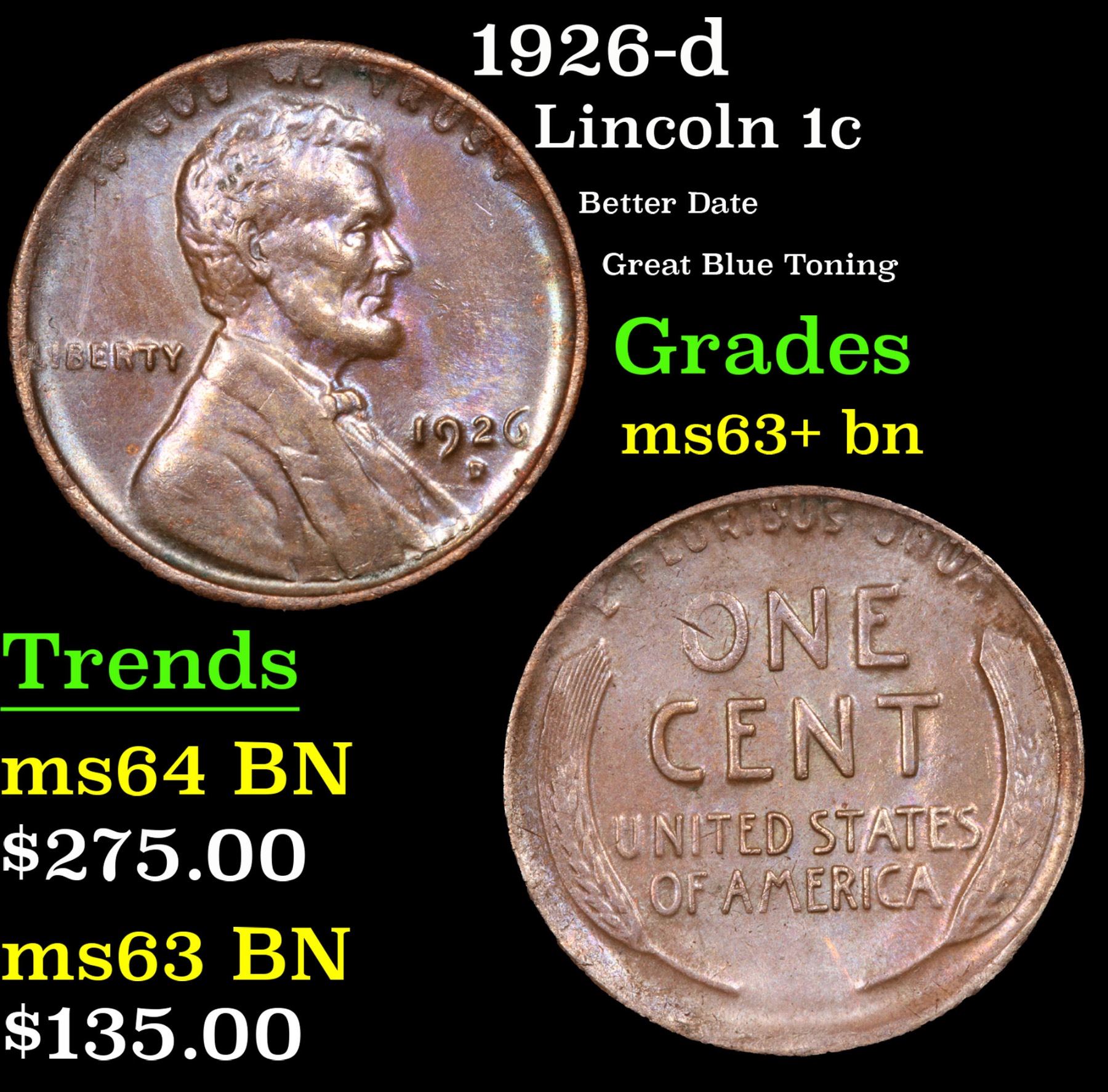 1926-d Better Date Great Blue Toning Lincoln Cent 1c Grades Select+ Unc BN.