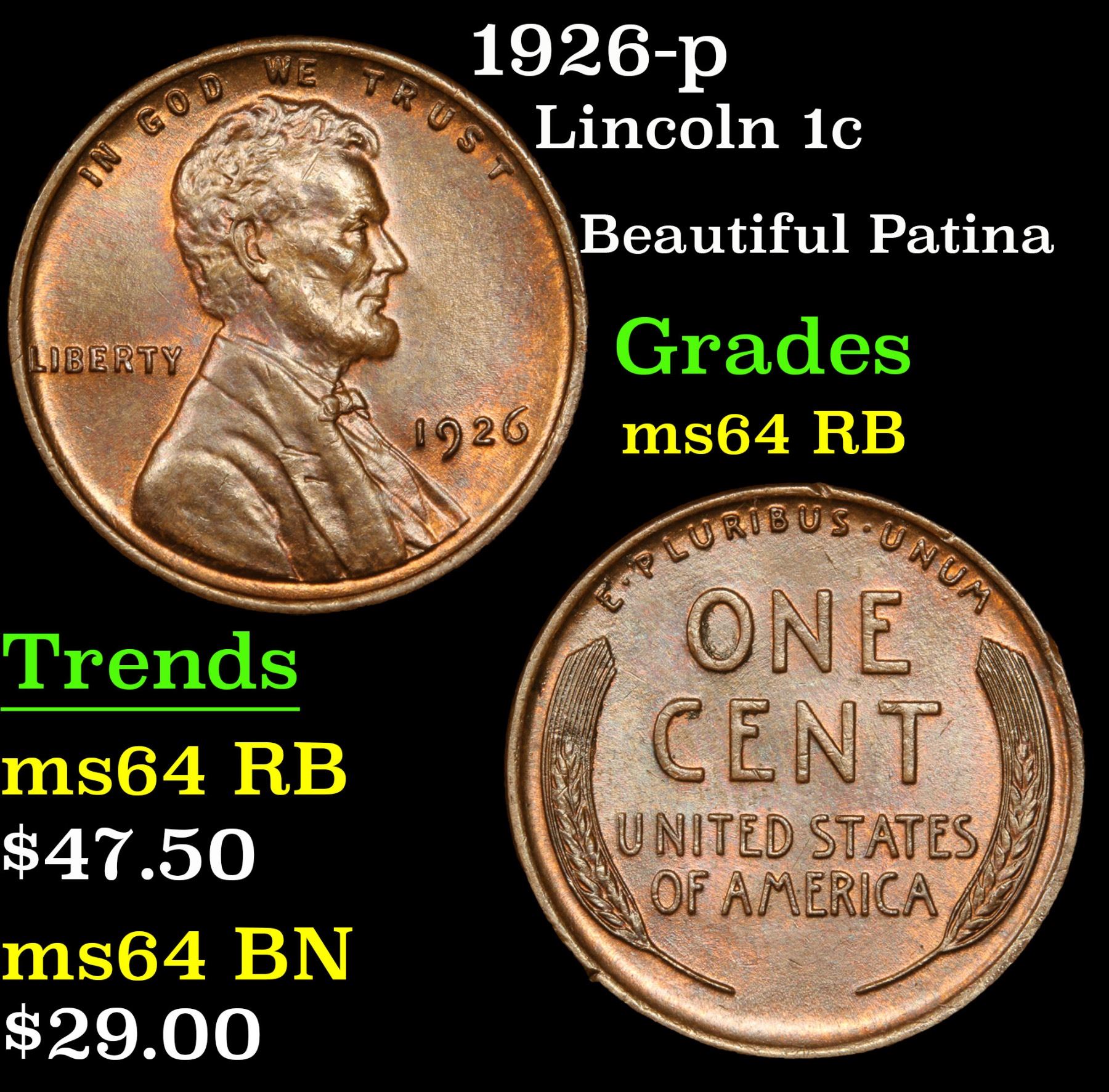 1926-p Lincoln Cent 1c Grades Choice Unc RB. Beautiful Patina