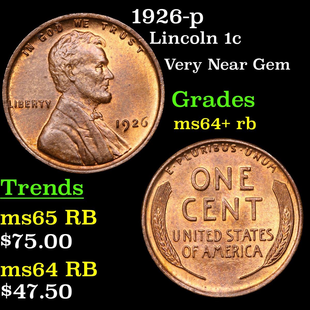 1926-p . Very Near Gem Lincoln Cent 1c Grades Choice+ Unc RB.