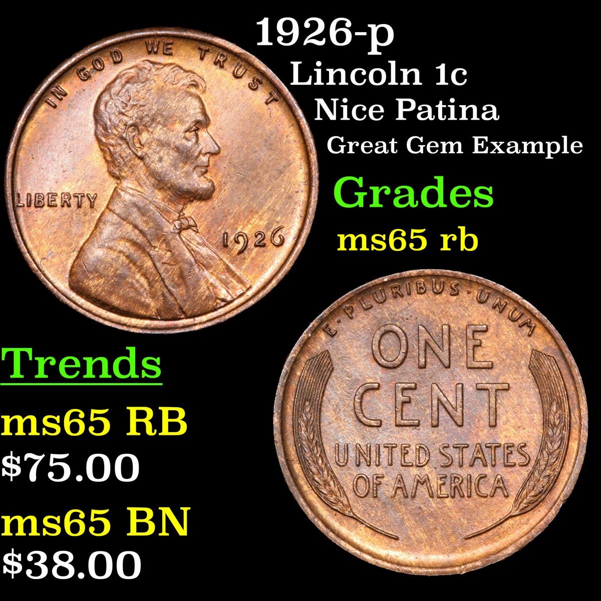 1926-p Nice Patina Great Gem Example Lincoln Cent 1c Grades GEM Unc RB.