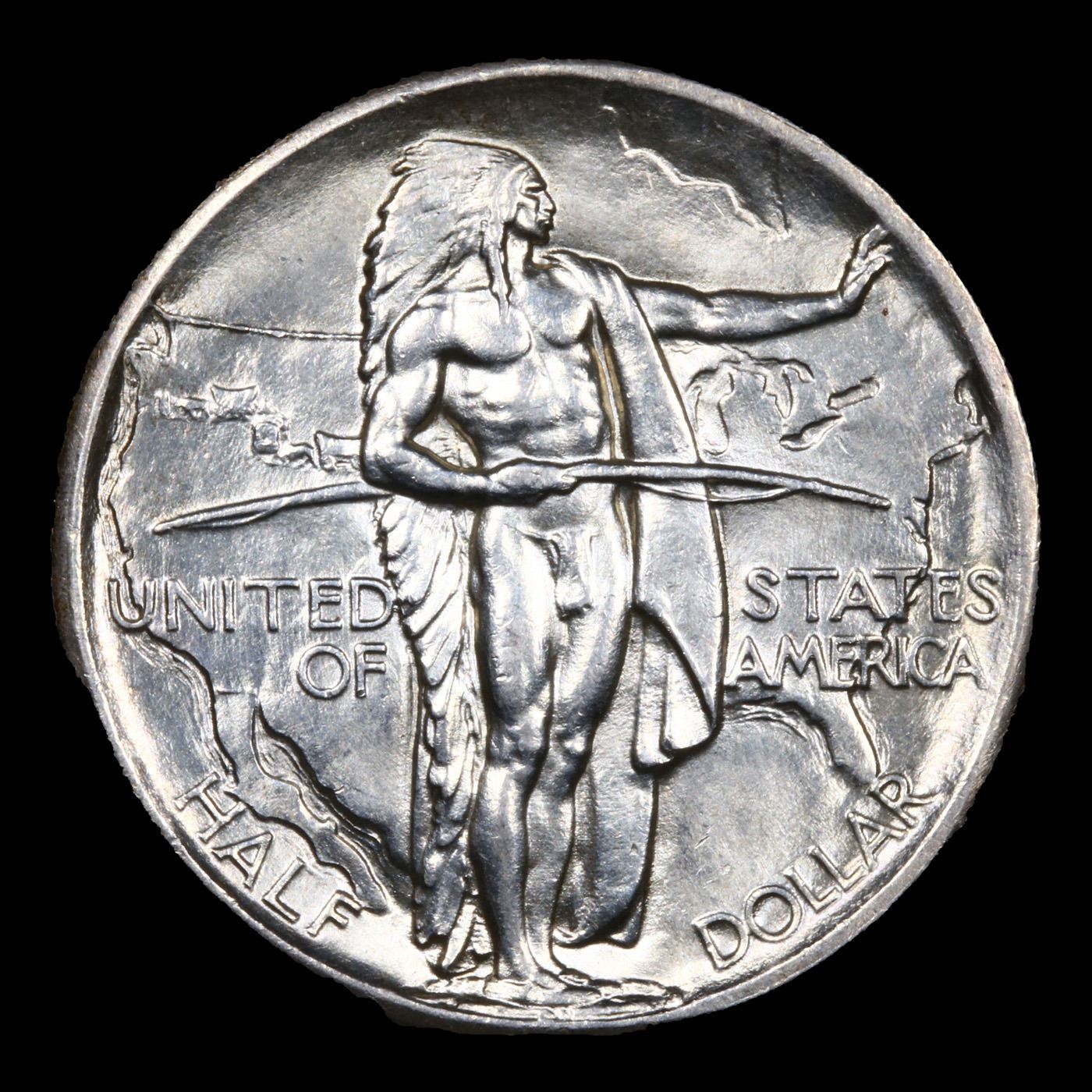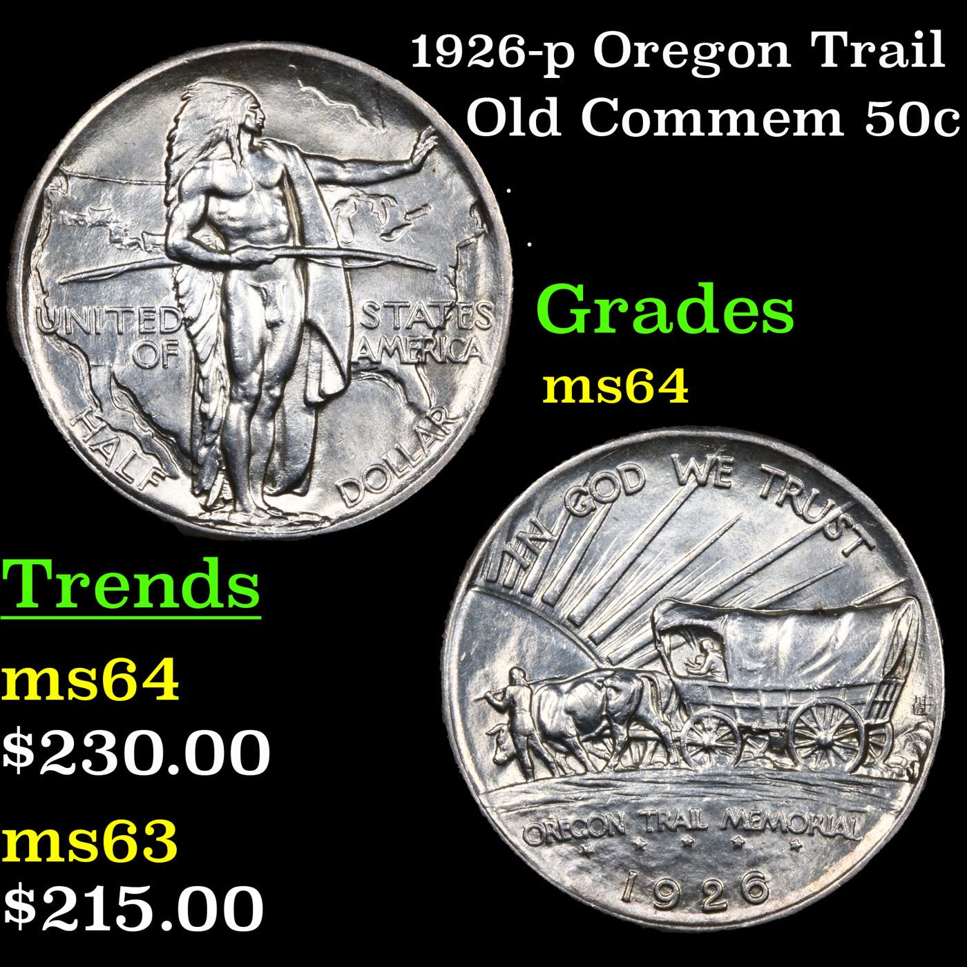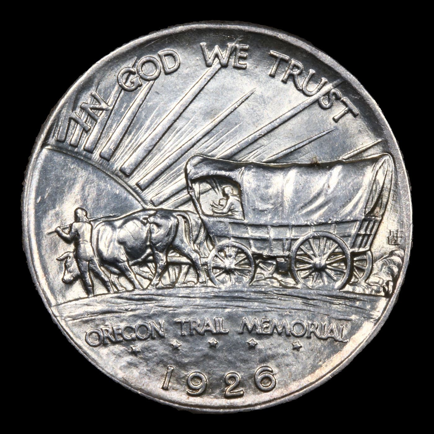 1926-p Oregon Trail Old Commem Half Dollar 50c Grades Choice Unc. Despite having one of the most beautiful design in the series, the Oregon Trail Half Dollar is usually cited as the best example of the abuses which began to take place within commemorative coin programs. Between the years 1926 and 1939, the coins were minted with eight different dates at three different mint facilities for varying prices, in an attempt to make as much money as possible.The obverse of the Oregon Trail Half Dollar was designed by Laura Gardin Fraser. It features a covered wagon drawn by two oxen moving west, towards the setting sun. (Officially, the US Mint states this as the obverse of the coin, although the designers of the coin and many collectors consider this the reverse of the coin.)The other side of the coin was designed by James Earle Fraser. The full figure of a Native American in headdress is shown. He stands before a map of the United States with the Oregon Trail marked, with his left hand outstretched to the east and a bow in his right hand spanning the continent. The maximum authorized mintage for the program was set at a lofty 6 million pieces, which was the largest authorization for commemorative coin thus far. For the first year of issue coins were struck at the Philadelphia Mint and San Francisco Mint and offered by the Oregon Trail Memorial Association for $1 each.Since the law authorizing the coins did not include a specific time frame or mint, the Association requested more coins struck in subsequent years and from different mints. Additional coins would be minted in 1928, 1933, 1934, 1936, 1937, 1938, and 1939, variously at the Philadelphia, Denver, and San Francisco Mints. Individual coin pricing varied from $1.50 to $2.00 to $1.60. The final two years were sold as complete sets from all three mints for $6.25 and later $7.50 each.When Buying an Oregon Trail Commemorative, regardless of year and mint the Points to first show wear are the Indian’s hand and thigh on the obverse and the ox and the bows of the wagon’s cover on the reverse, these are the high points.