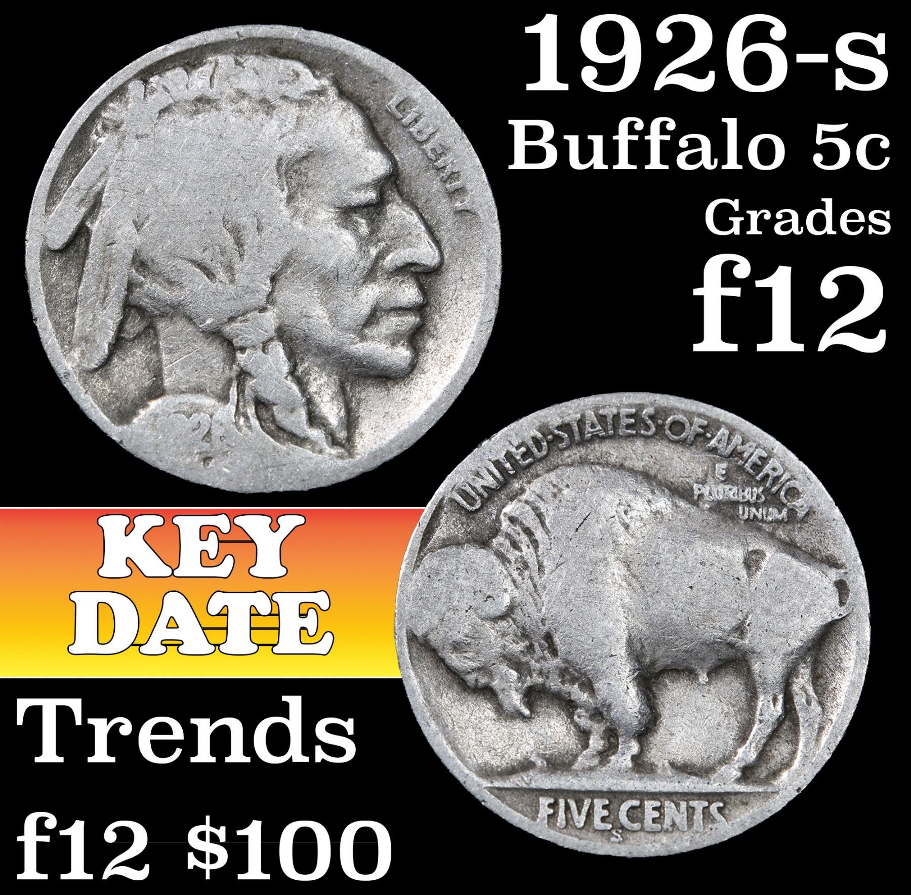 1926-s Buffalo Nickel 5c Grades f, fine. To Quote David Hall: "The 1926-s is exceptionally rare in mint state condition and in Gem MS65 it is the rarest non-variety Buffalo nickel and as such it is one of the most important rarities of 20th Century numismatics. I have never seen or heard of a specimen grading above MS65. Strike can be somewhat of a problem with this issue, but not as much so as with teh 1920-s, 1923-s and 1925-s. It's not the strike, it's the fact that not many Gem examples exist at all. Luster is of the subdued semi-satiny type. Excluding the 1918/7-d overdate, this issue is THE KEY date to the Buffalo nickel series."