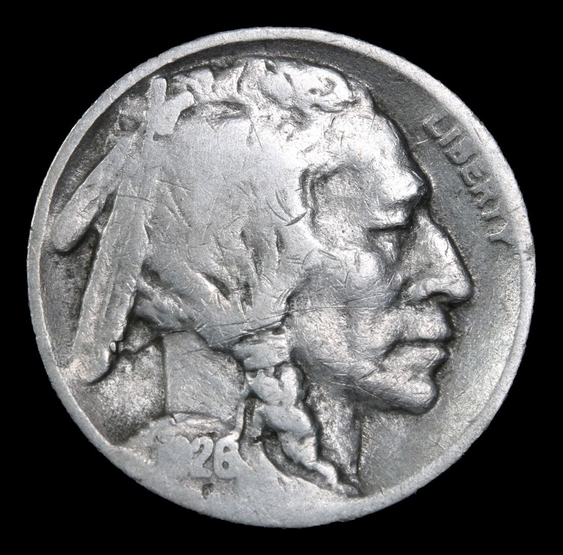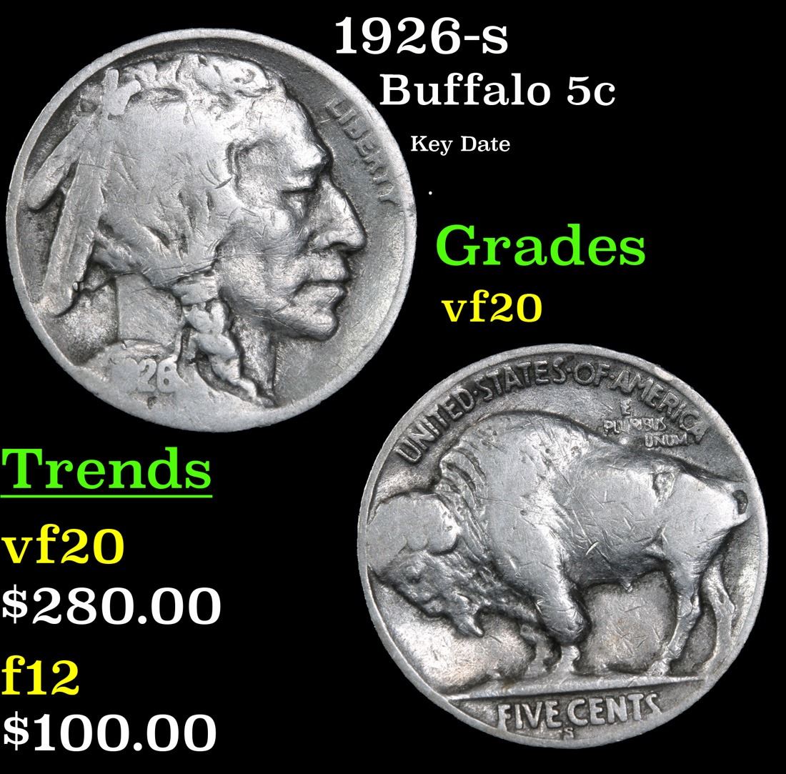 1926-s Key Date . Buffalo Nickel 5c Grades vf, very fine. To Quote David Hall: "The 1926-s is exceptionally rare in mint state condition and in Gem MS65 it is the rarest non-variety Buffalo nickel and as such it is one of the most important rarities of 20th Century numismatics. I have never seen or heard of a specimen grading above MS65. Strike can be somewhat of a problem with this issue, but not as much so as with teh 1920-s, 1923-s and 1925-s. It's not the strike, it's the fact that not many Gem examples exist at all. Luster is of the subdued semi-satiny type. Excluding the 1918/7-d overdate, this issue is THE KEY date to the Buffalo nickel series."