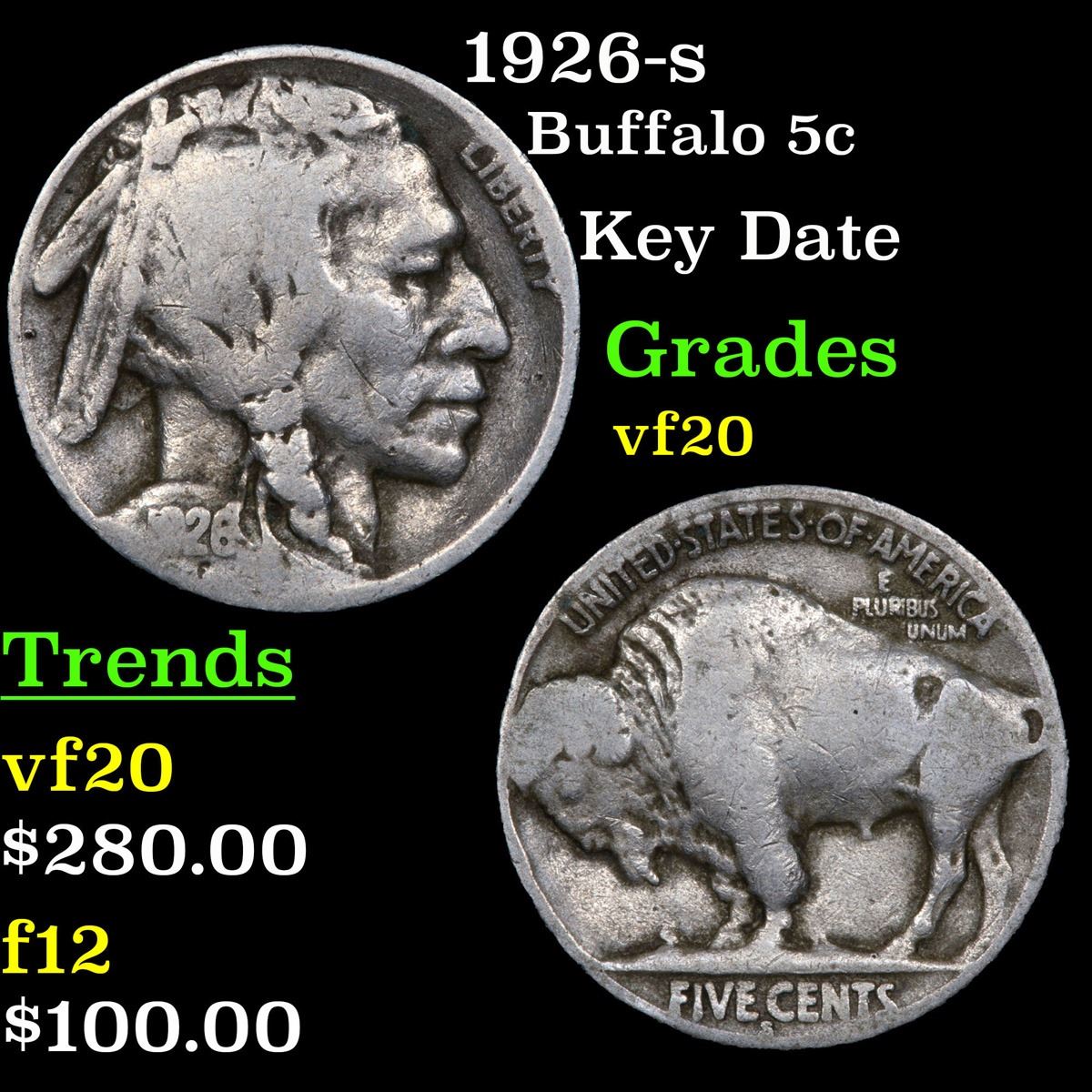 1926-s Buffalo Nickel 5c Grades vf, very fine. To Quote David Hall: "The 1926-s is exceptionally rare in mint state condition and in Gem MS65 it is the rarest non-variety Buffalo nickel and as such it is one of the most important rarities of 20th Century numismatics. I have never seen or heard of a specimen grading above MS65. Strike can be somewhat of a problem with this issue, but not as much so as with teh 1920-s, 1923-s and 1925-s. It's not the strike, it's the fact that not many Gem examples exist at all. Luster is of the subdued semi-satiny type. Excluding the 1918/7-d overdate, this issue is THE KEY date to the Buffalo nickel series."