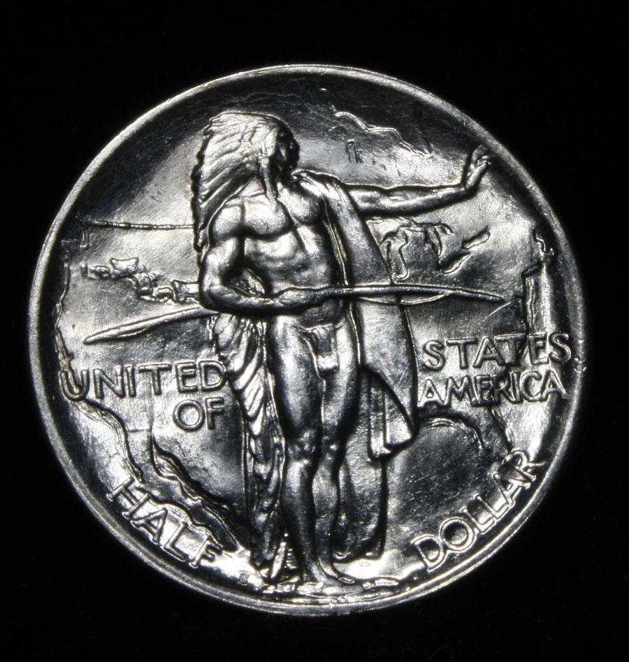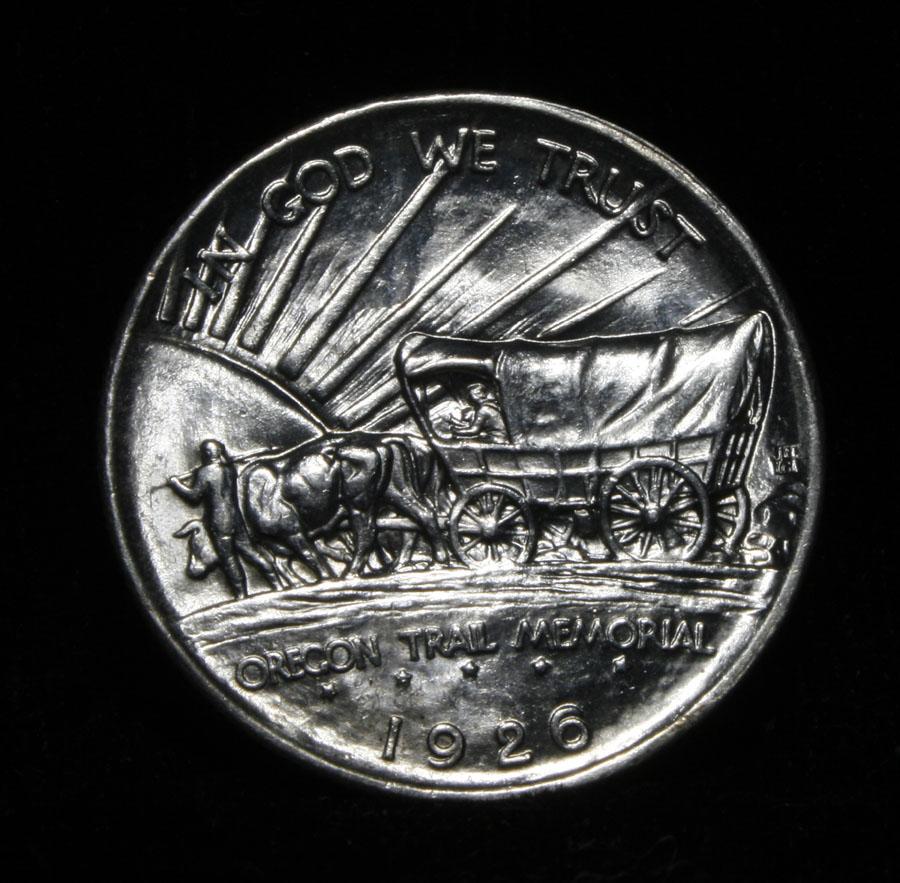 A fantastic striking of a Great and Beautiful coin. One of the most beautifully designed coins in American History, Designed by the same engraver that designed the Buffalo Nickel, This coin Commemorates the Oregon Trail that brought thousands of Intrepid pioneers to the West in the 1830's and 40's. When Buying an Oregon Trail Commemorative, regardless of year and mint the Points to first show wear are the Indian’s hand and thigh on the obverse and the ox and the bows of the wagon’s cover on the reverse, these are the high points. Coin World's Coin Values lists ms66 at $500 and The Wholesale Greysheet lists ms66 at $365. Estimated Value $425.