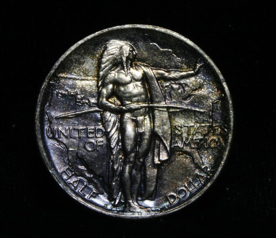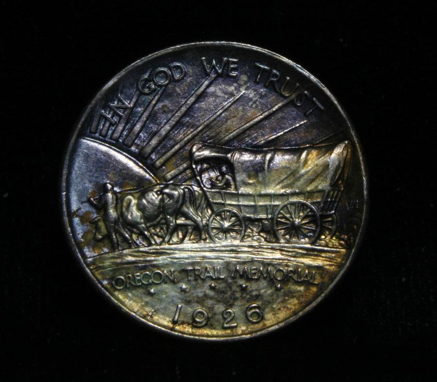 Stunning rainbow toning on a Great and Lustrous Gem. A fantastic striking of a Great and Beautiful coin. One of the most beautifully designed coins in American History, Designed by the same engraver that designed the Buffalo Nickel, This coin Commemorates the Oregon Trail that brought thousands of Intrepid pioneers to the West in the 1830's and 40's. When Buying an Oregon Trail Commemorative, regardless of year and mint the Points to first show wear are the Indian’s hand and thigh on the obverse and the ox and the bows of the wagon’s cover on the reverse, these are the high points. Coin World's Coin Values lists ms66 at $500 and The Wholesale Greysheet lists ms66 at $365. But those prices do not account for the vastly superior eye appeal of the rainbow toning. Estimated Value $500.