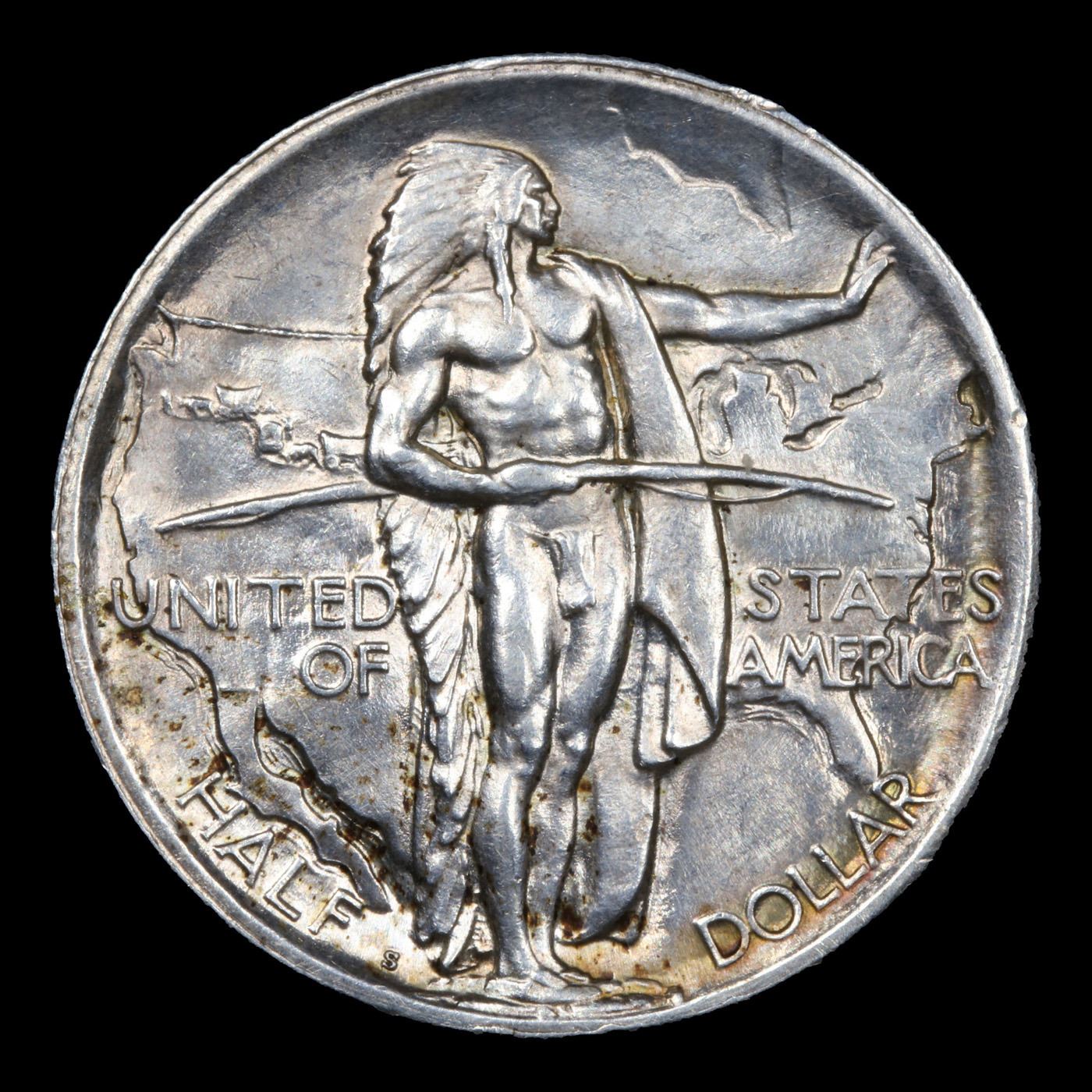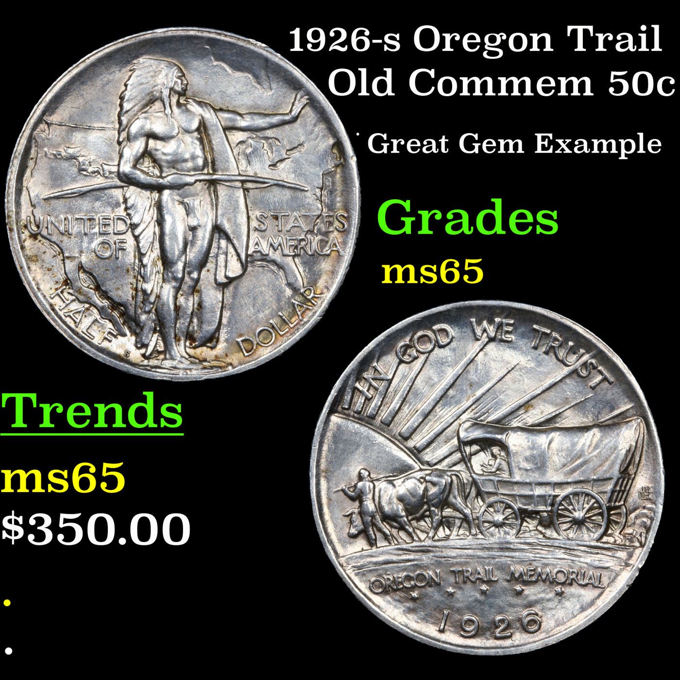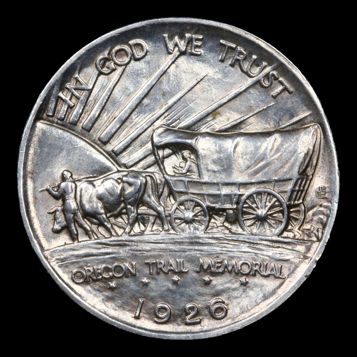 1926-s Oregon Trail Old Commem Half Dollar 50c Graded GEM Unc. One of the most beautifully designed coins in American History, Designed by the same engraver that designed the Buffalo Nickel, This coin Commemorates the Oregon Trail that brought thousands of Intrepid pioneers to the West in the 1830's and 40's. When Buying an Oregon Trail Commemorative, regardless of year and mint the Points to first show wear are the Indian’s hand and thigh on the obverse and the ox and the bows of the wagon’s cover on the reverse, these are the high points.