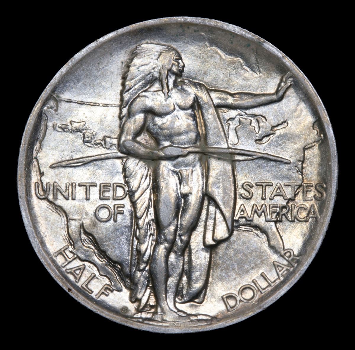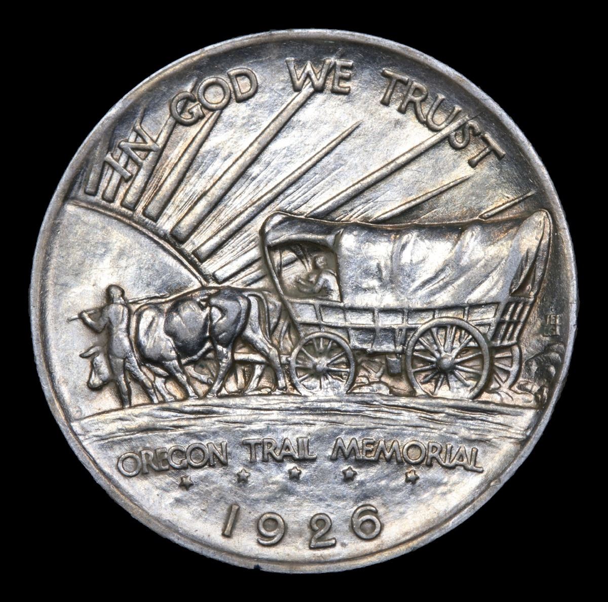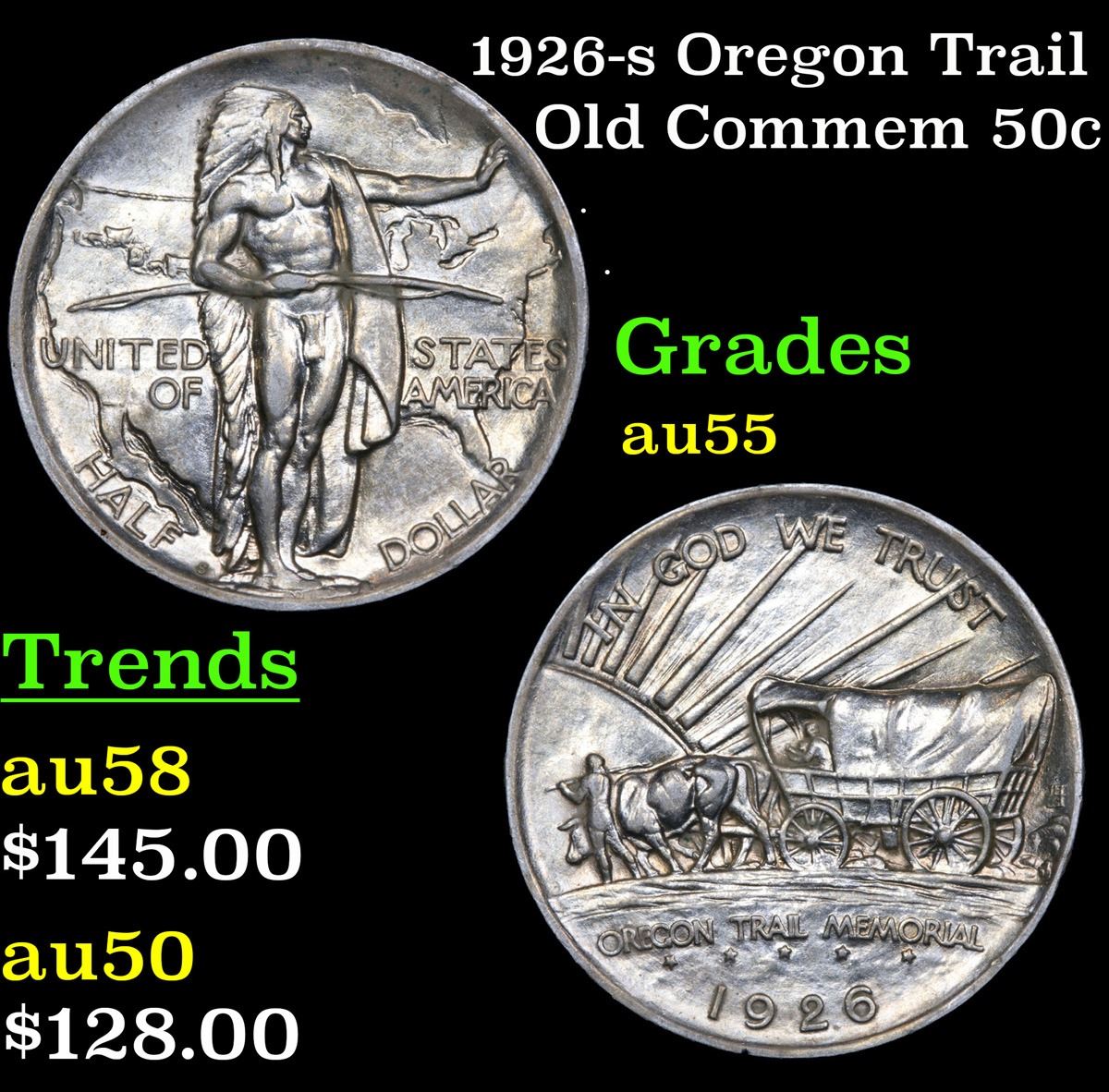 1926-s Oregon Trail Old Commem Half Dollar 50c Grades Choice AU. One of the most beautifully designed coins in American History, Designed by the same engraver that designed the Buffalo Nickel, This coin Commemorates the Oregon Trail that brought thousands of Intrepid pioneers to the West in the 1830's and 40's. When Buying an Oregon Trail Commemorative, regardless of year and mint the Points to first show wear are the Indian’s hand and thigh on the obverse and the ox and the bows of the wagon’s cover on the reverse, these are the high points.