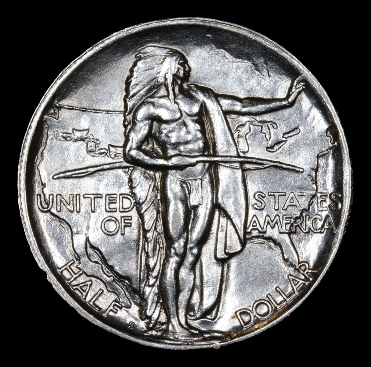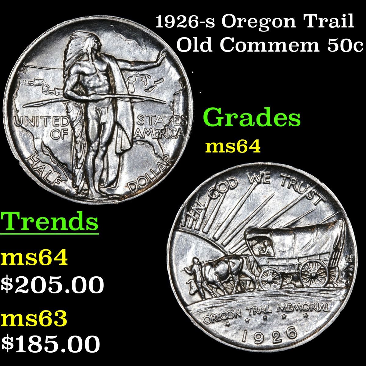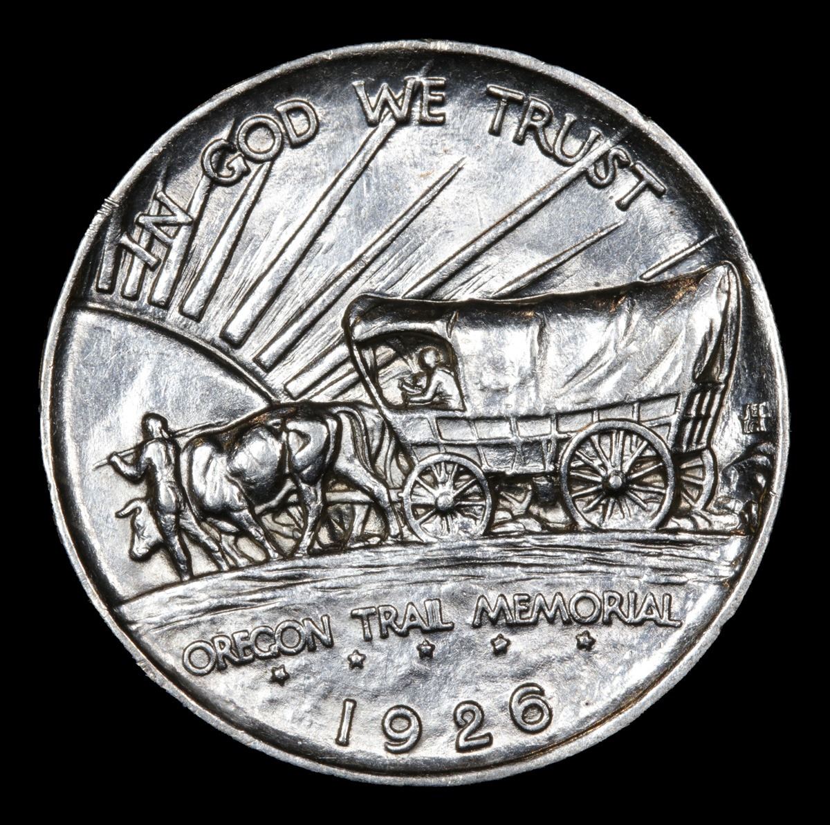 1926-s Oregon Trail . . Old Commem Half Dollar 50c Grades Choice Unc. One of the most beautifully designed coins in American History, Designed by the same engraver that designed the Buffalo Nickel, This coin Commemorates the Oregon Trail that brought thousands of Intrepid pioneers to the West in the 1830's and 40's. When Buying an Oregon Trail Commemorative, regardless of year and mint the Points to first show wear are the Indian’s hand and thigh on the obverse and the ox and the bows of the wagon’s cover on the reverse, these are the high points.
