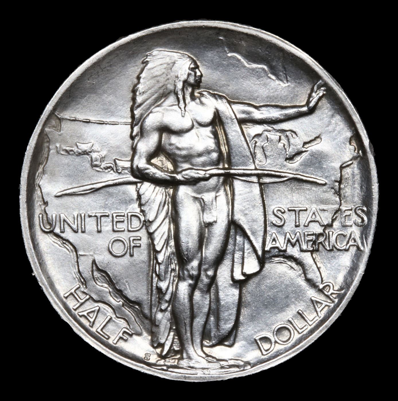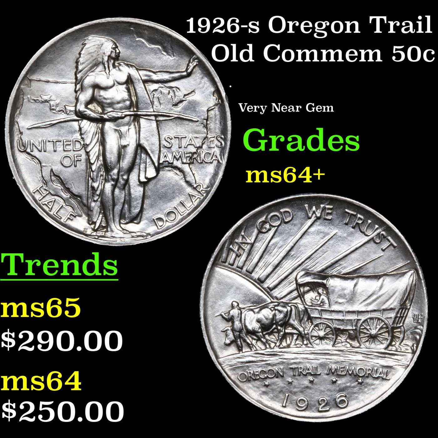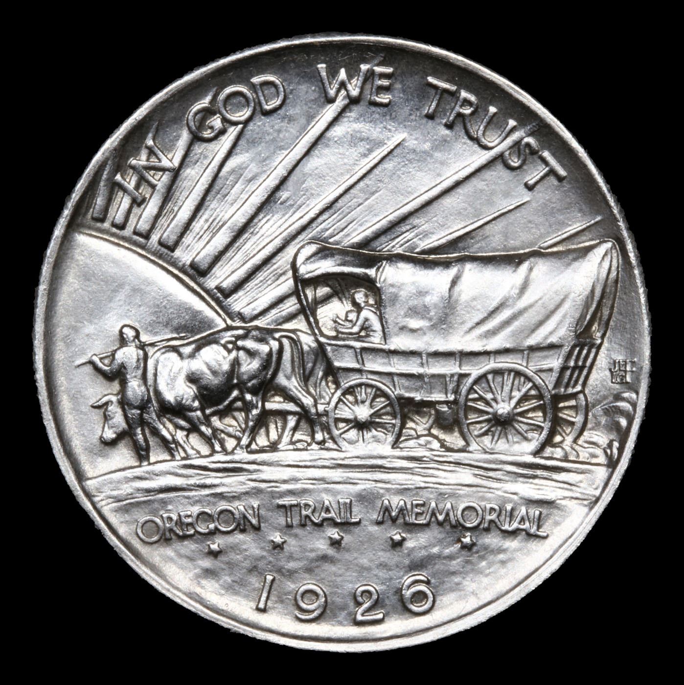 1926-s Oregon Trail Old Commem Half Dollar 50c Grades Choice+ Unc. Despite having one of the most beautiful design in the series, the Oregon Trail Half Dollar is usually cited as the best example of the abuses which began to take place within commemorative coin programs. Between the years 1926 and 1939, the coins were minted with eight different dates at three different mint facilities for varying prices, in an attempt to make as much money as possible.The obverse of the Oregon Trail Half Dollar was designed by Laura Gardin Fraser. It features a covered wagon drawn by two oxen moving west, towards the setting sun. (Officially, the US Mint states this as the obverse of the coin, although the designers of the coin and many collectors consider this the reverse of the coin.)The other side of the coin was designed by James Earle Fraser. The full figure of a Native American in headdress is shown. He stands before a map of the United States with the Oregon Trail marked, with his left hand outstretched to the east and a bow in his right hand spanning the continent. The maximum authorized mintage for the program was set at a lofty 6 million pieces, which was the largest authorization for commemorative coin thus far. For the first year of issue coins were struck at the Philadelphia Mint and San Francisco Mint and offered by the Oregon Trail Memorial Association for $1 each.Since the law authorizing the coins did not include a specific time frame or mint, the Association requested more coins struck in subsequent years and from different mints. Additional coins would be minted in 1928, 1933, 1934, 1936, 1937, 1938, and 1939, variously at the Philadelphia, Denver, and San Francisco Mints. Individual coin pricing varied from $1.50 to $2.00 to $1.60. The final two years were sold as complete sets from all three mints for $6.25 and later $7.50 each.When Buying an Oregon Trail Commemorative, regardless of year and mint the Points to first show wear are the Indian’s hand and thigh on the obverse and the ox and the bows of the wagon’s cover on the reverse, these are the high points.