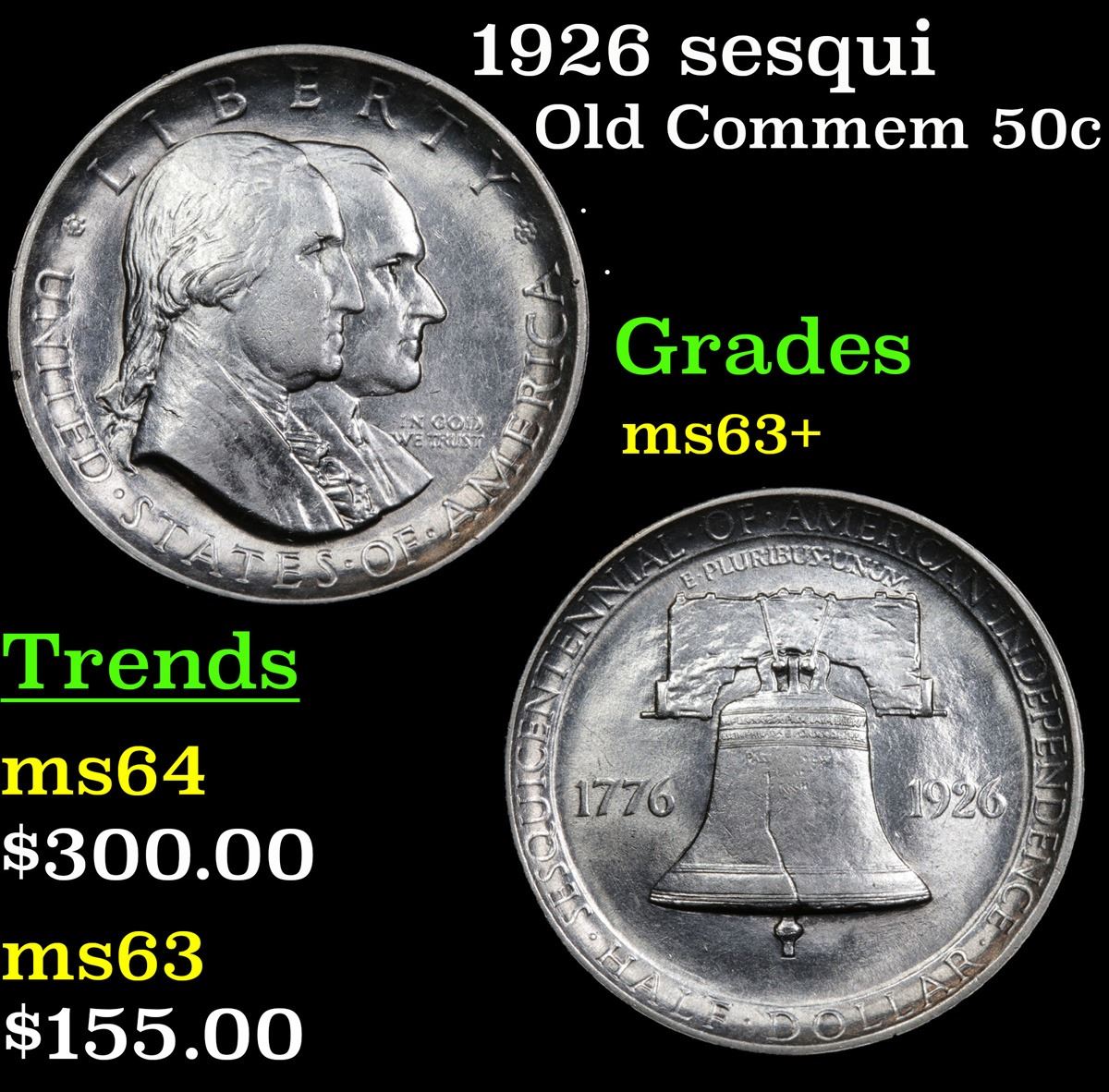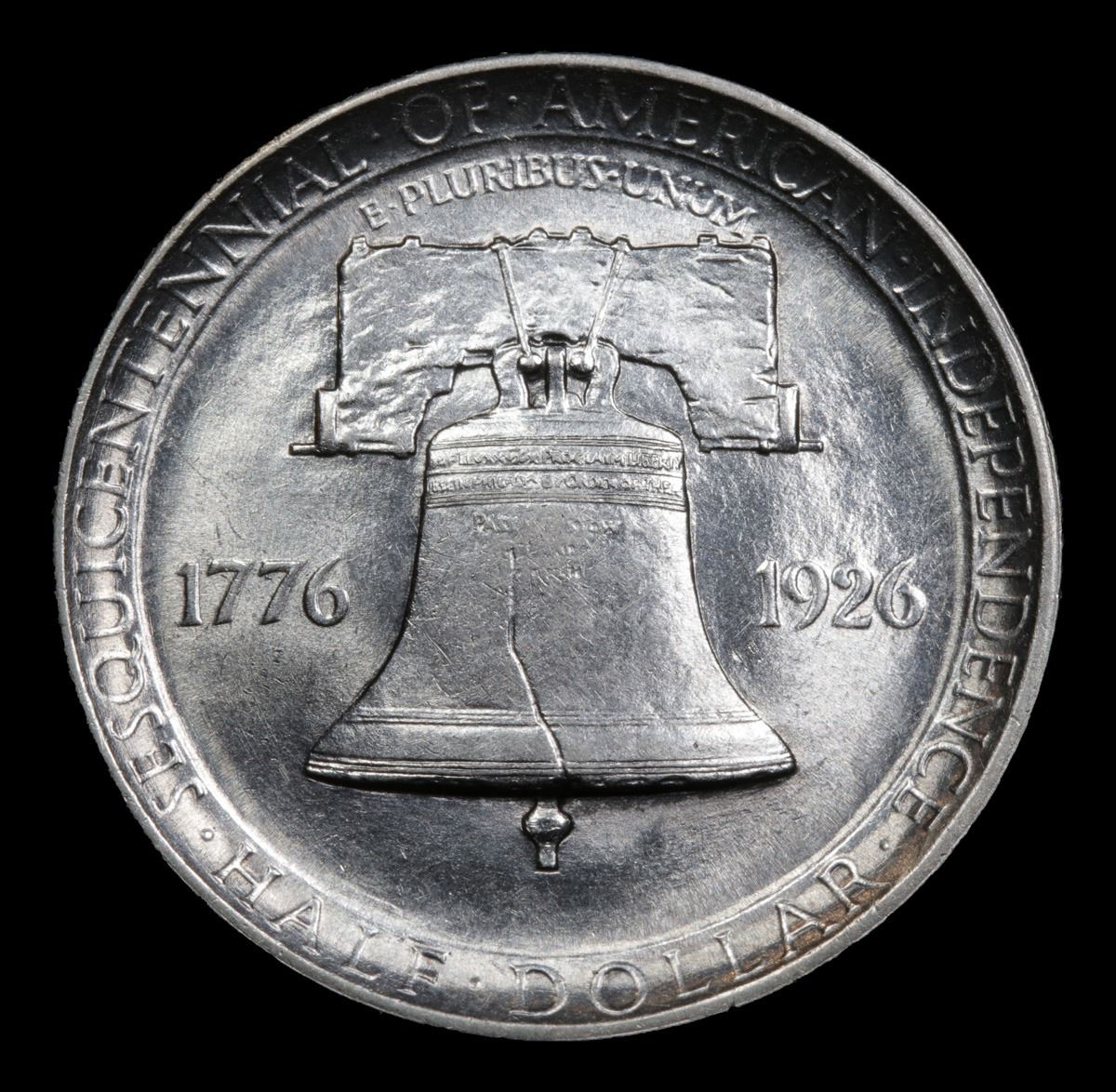 1926 sesqui Old Commem Half Dollar 50c Grades Select+ Unc. This Coin is Very Reminiscent of The Reverse of the Franklin Half which would be Used 22 Years After this Coin was Struck. When Examining a Sesquicentennial Commemorative The first places to show wear on the coins are Washington's cheekbone and the lower part of the bell.