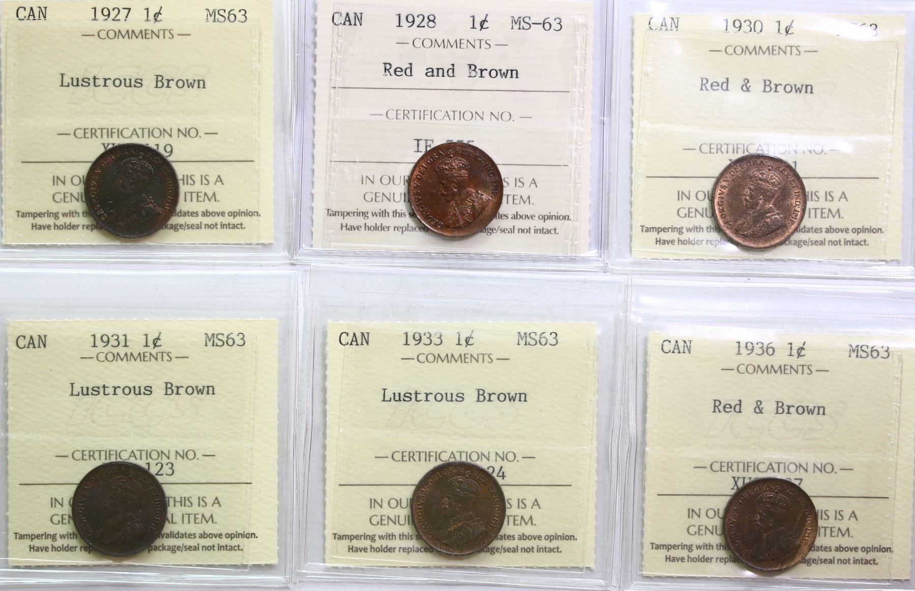 1927 1¢, 1928, 1930, 1931, 1933, 1936, All 6 coins ICCS Choice Mint State-63.