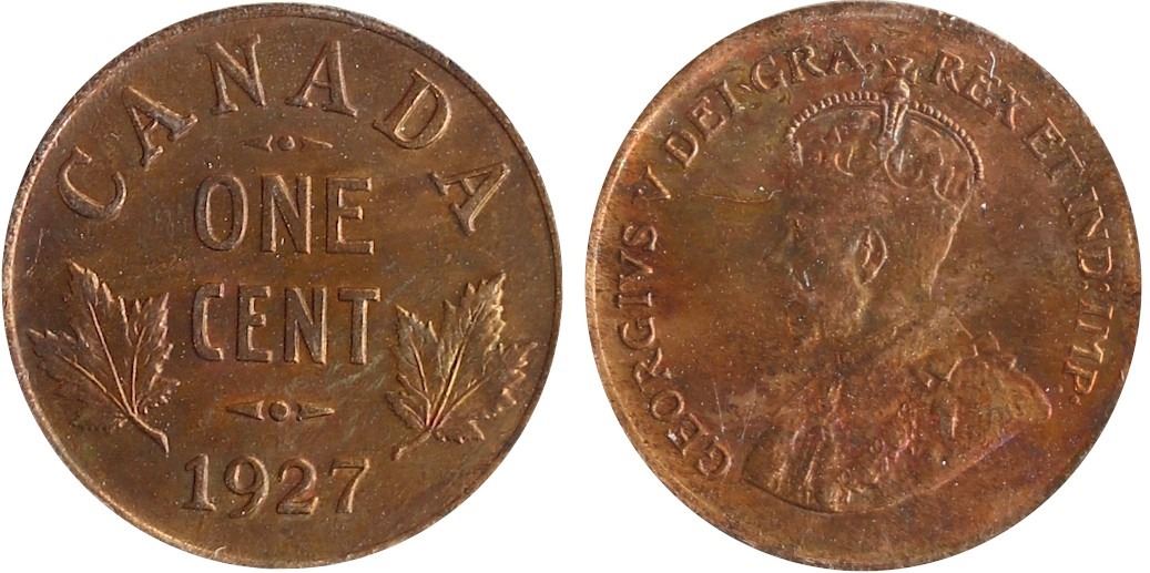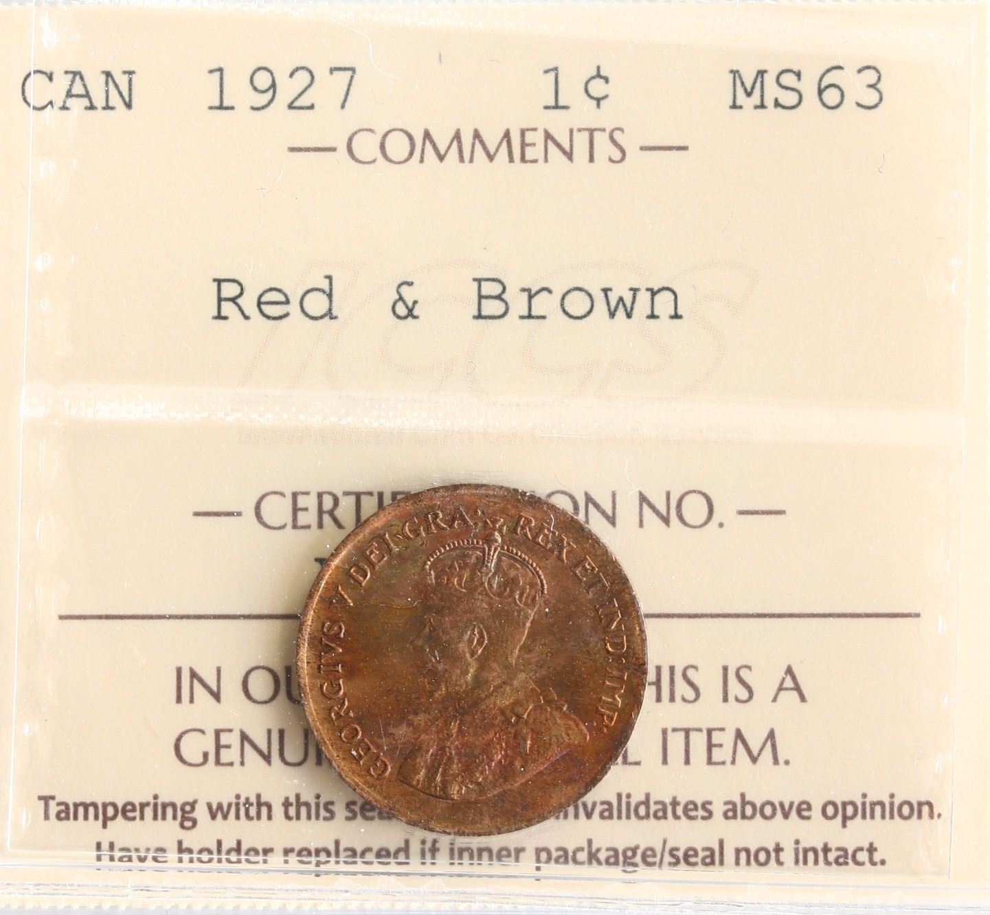 1927 1¢ ICCS Choice Mint State-63 with irridescent toning. A lovely example.