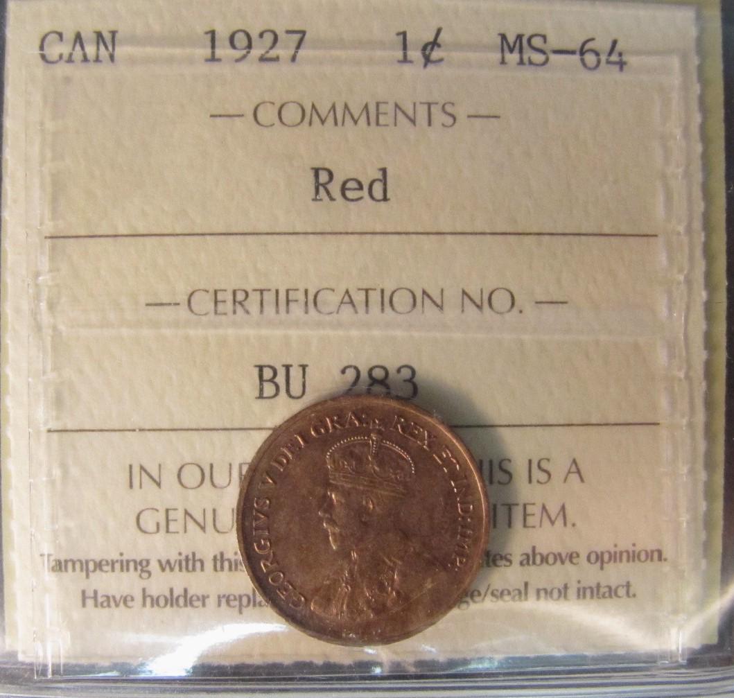 1927 1¢ ICCS MS64RD. 75% red but bright with lustre.