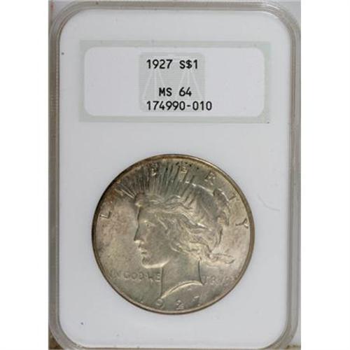 <B>1927 $1 MS64 NGC.</B></I> NGC Census: (709/74). PCGS Population (1220/218). Mintage: 848,000. Numismedia Wsl. Price for NGC/PCGS coin in MS64: $380. (#7370)<BR><BR><B>Coin Engraver:</B> Anthony de Francisci<BR><BR><b>Shipping:</b> Coins & Currency (<a target="_blank" href="http://www.heritageauctions.com/common/shipping.php">view shipping information</a>)